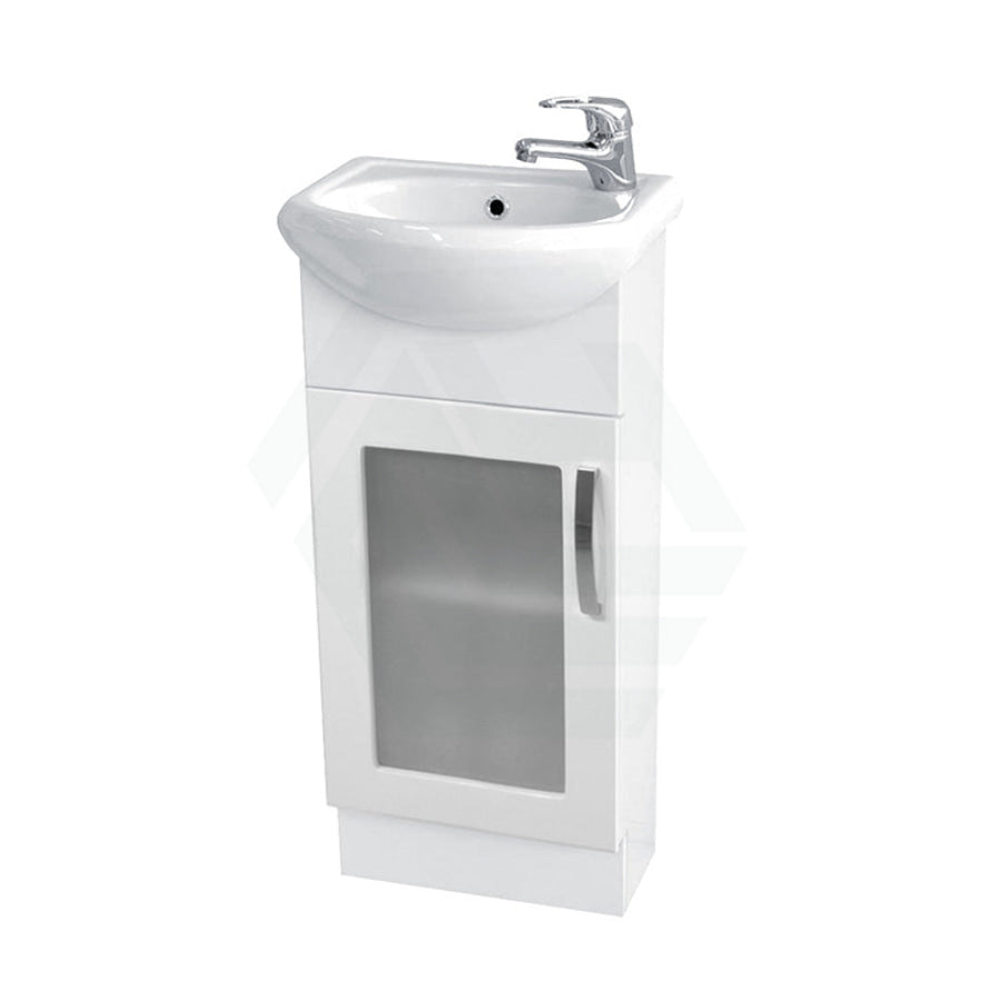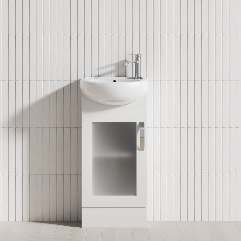 The Fienza 400mm Freestanding Kickboard Vanity Glass Door Gloss White MDF Board with Single Bowl Ceramic Top brings comfort and function together in the bathroom, equipped with soft closing design.