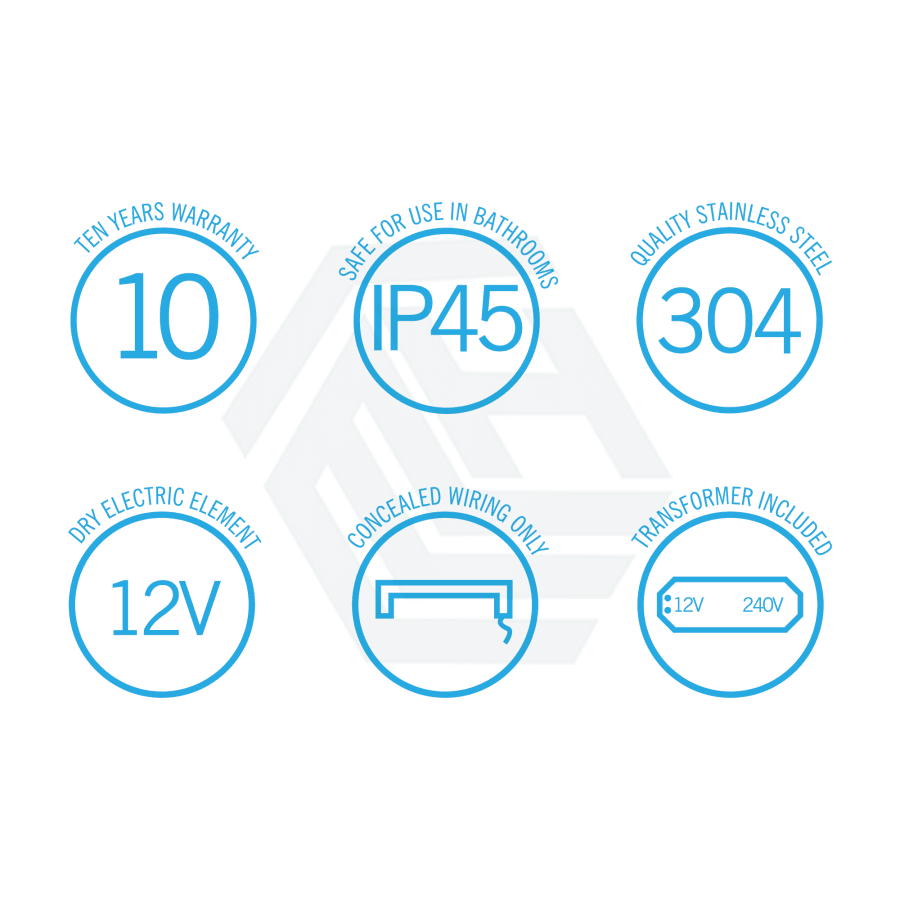 The Thermorail single bar heated towel rails are all 12 volt which means they are safe to be installed anywhere in the bathroom, even close to water. The single rails are designed to be installed in a series of rails limited only by your imagination. We do however recommend a minimum of 3 single rails are used in a set to provide enough heated surface area in contact with your towels to help them to dry.