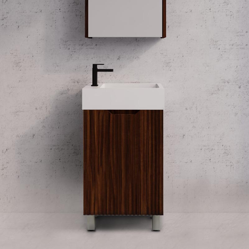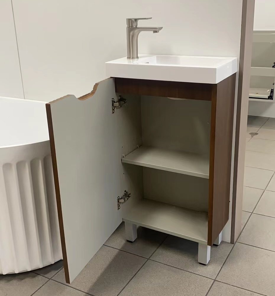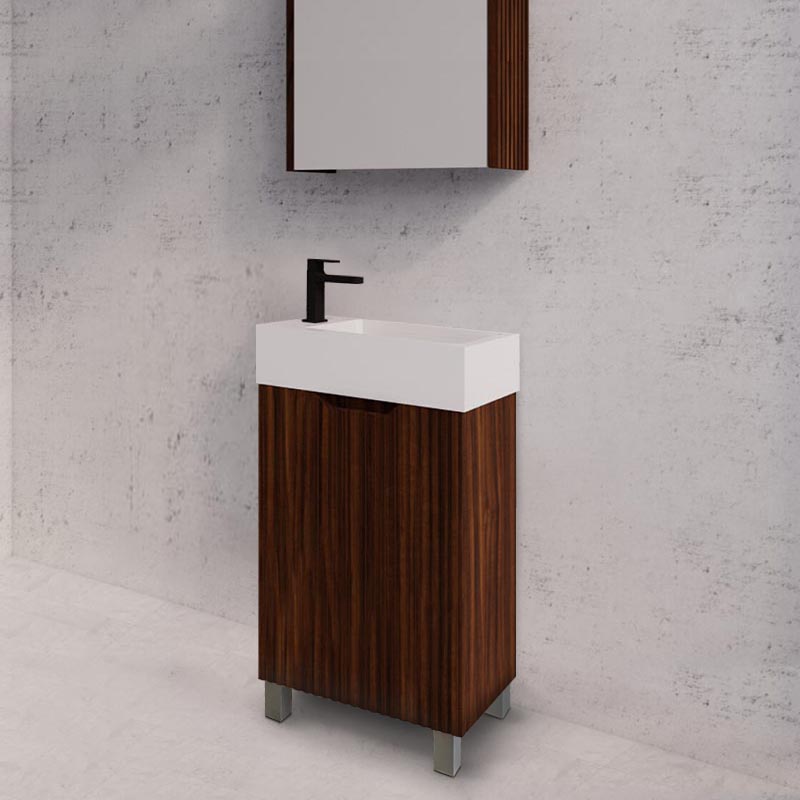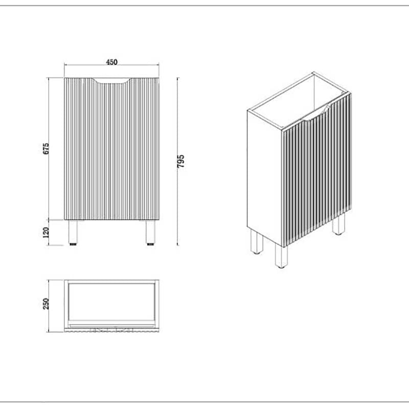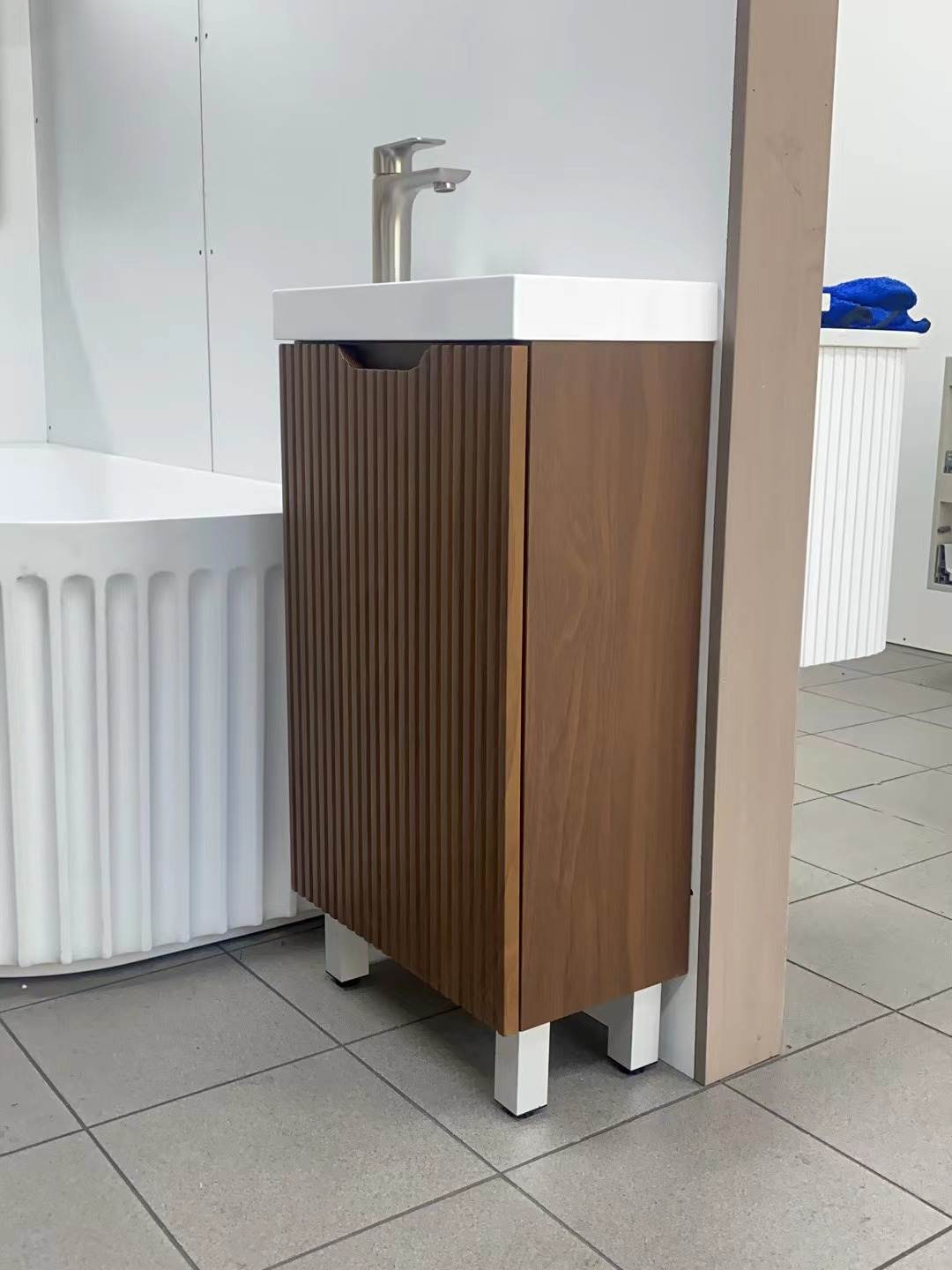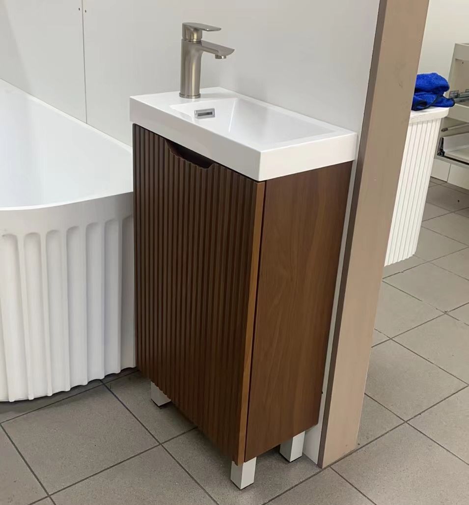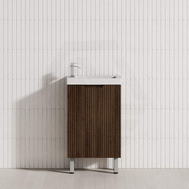 450x250x795mm Freestanding vanity with legs is built to impress, with its PVC coated left hand hinge and fluted panel for extra durability. It's the ideal choice for a mini bathroom, offering an Brown oak colour that will complement any style.