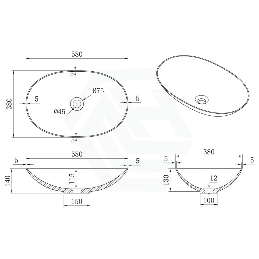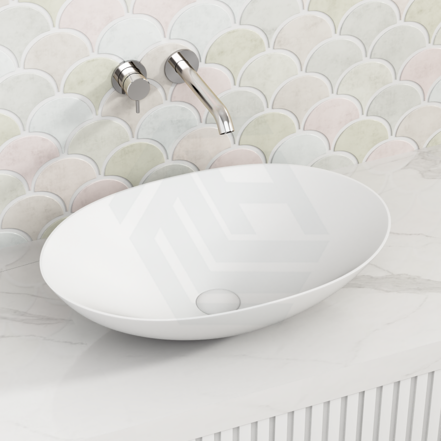 580x380x140mm Kirkby Oval Solid Surface Stone Above Counter Art Basin Matt White