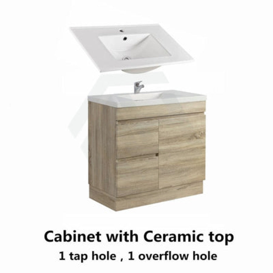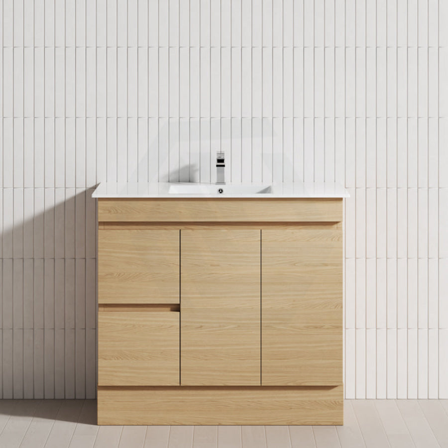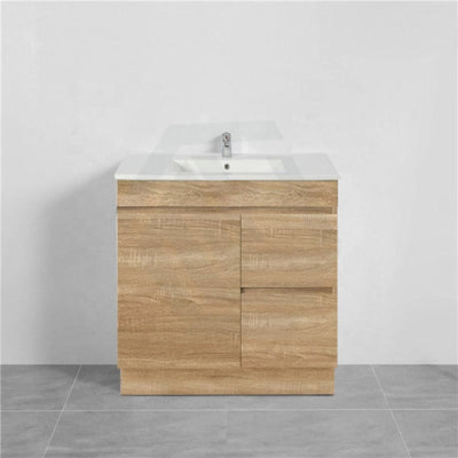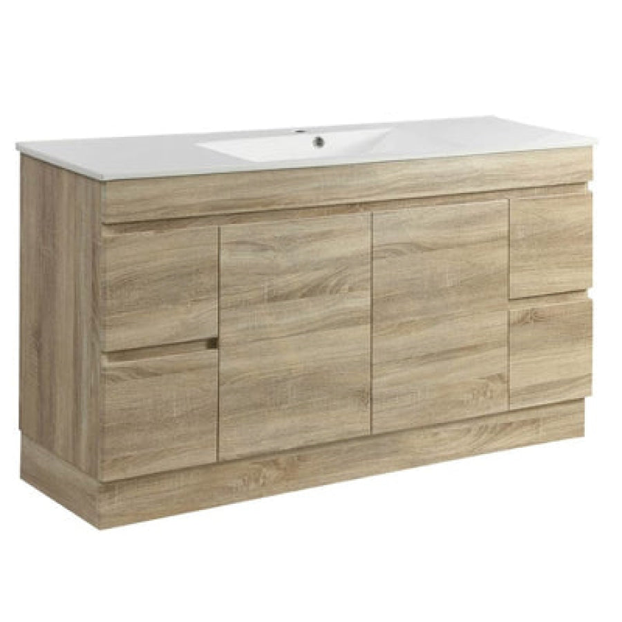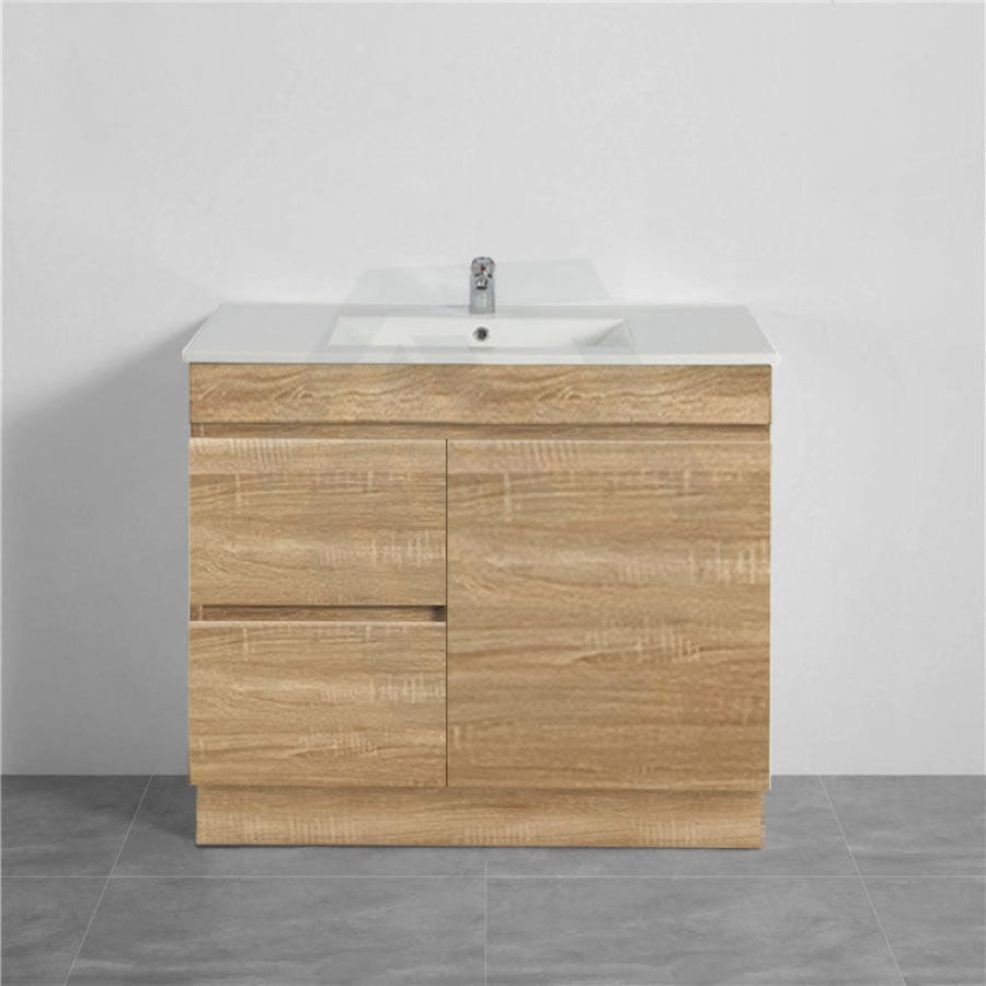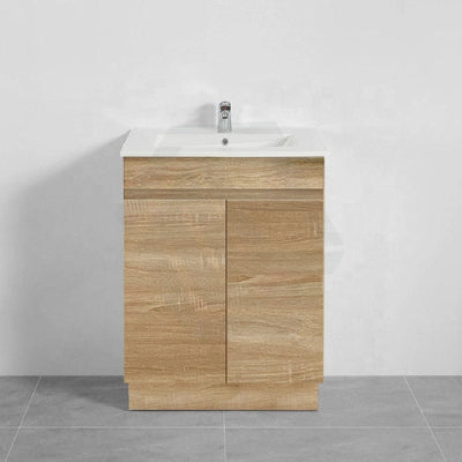 600-1500mm Berge Freestanding Bathroom Floor Vanity with Kickboard White Oak Wood Grain PVC Filmed Cabinet ONLY & Ceramic/Poly Top Available