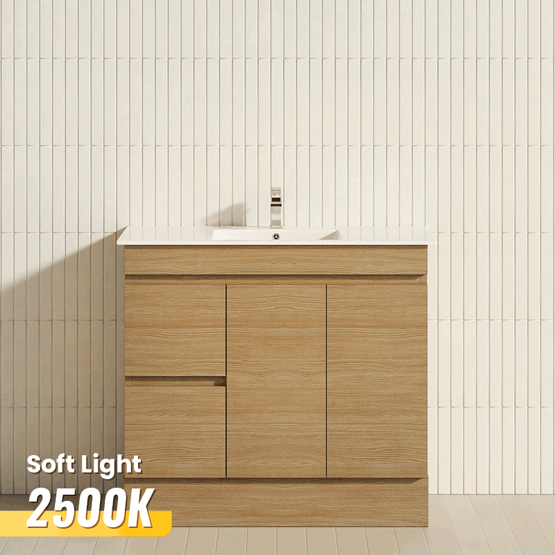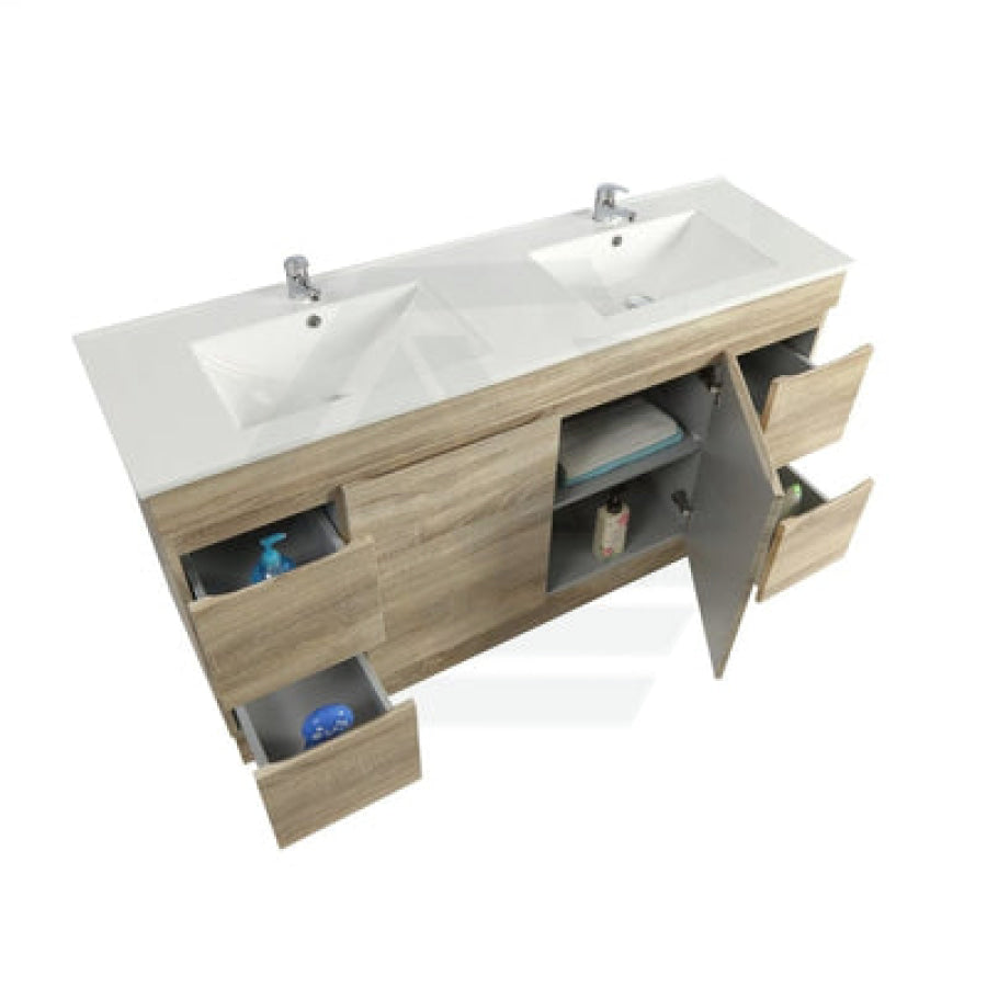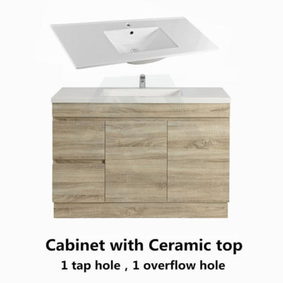 Transform your bathroom with the 600-1500mm Berge Freestanding Bathroom Floor Vanity. Crafted with a kickboard and White Oak Wood Grain PVC Filmed Cabinet, this piece exudes elegance and functionality. Choose between a Ceramic or Poly Top for the perfect finishing touch. Elevate your bathroom experience today!