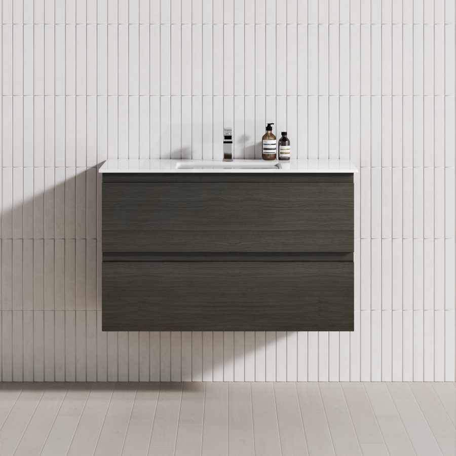The 600-1500mm Wall Hung Bathroom Floating Vanity Dark Grey Wood Grain PVC Filmed Drawers Cabinet ONLY & Ceramic/Poly Top Available brings comfort and function together in the bathroom, equipped with soft closing design.