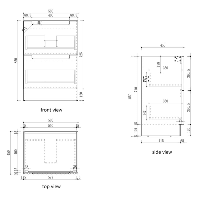 | Dimensions | ALX-CA56-600 (580x450x850mm)/ ALX-CA56-750 (730x450x850mm)/ ALX-CA56-900 (880x450x850mm)/ ALX-CA56-1200 (1180x450x850mm)/ ALX-CA56-1500 (1480x450x850mm)/ ALX-CA56-1800 (1780x450x850mm)/ Refer to photo zone ( Please allow exist 3-5cm deviation due to the manual measurement ) |