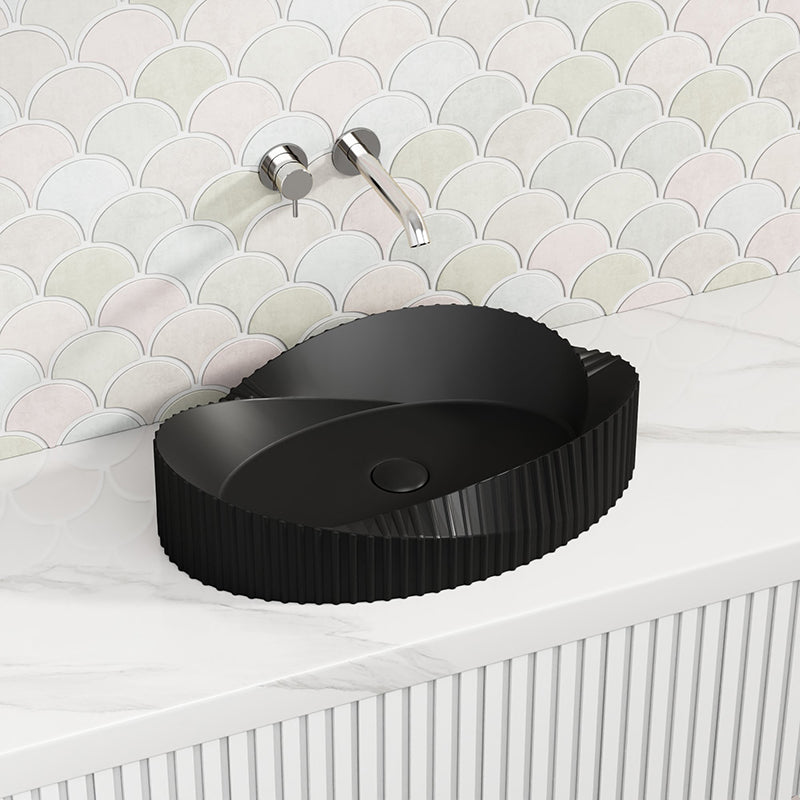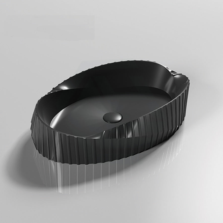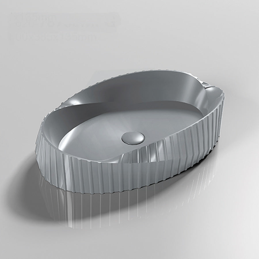 This 600x385x135mm ceramic basin features a unique fluted design that adds a distinct, elegant touch to any bathroom. Designed for above-counter installation, its special shape combines both form and functionality. Available in various colors, this basin allows customization to match diverse interior styles while providing durable, easy-to-clean ceramic construction for lasting use and hygiene.