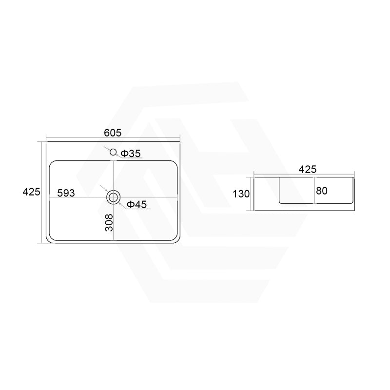 Lukka 605x425x130mm Above Counter / Wall Hung Rectangle Gloss White Ceramic Basin with Tap Hole