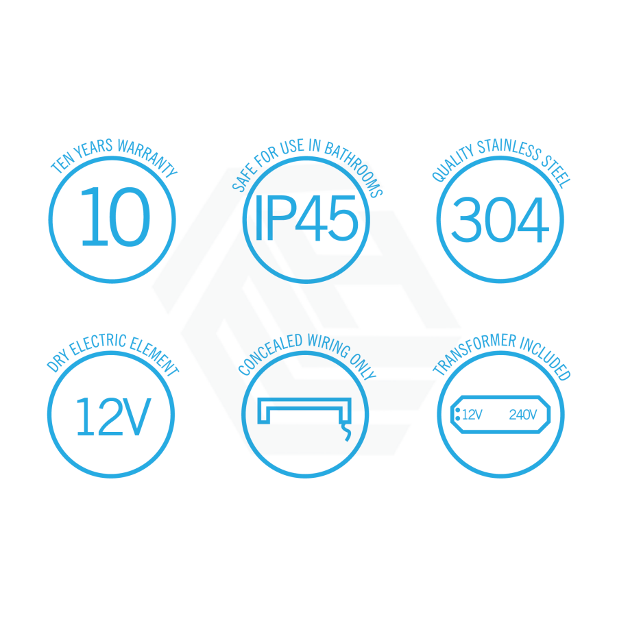 The Thermorail single bar heated towel rails are all 12 volt which means they are safe to be installed anywhere in the bathroom, even close to water. The single rails are designed to be installed in a series of rails limited only by your imagination. We do however recommend a minimum of 3 single rails are used in a set to provide enough heated surface area in contact with your towels to help them to dry.