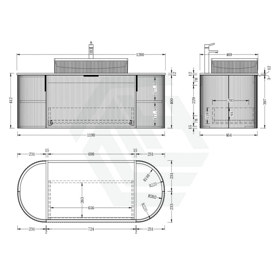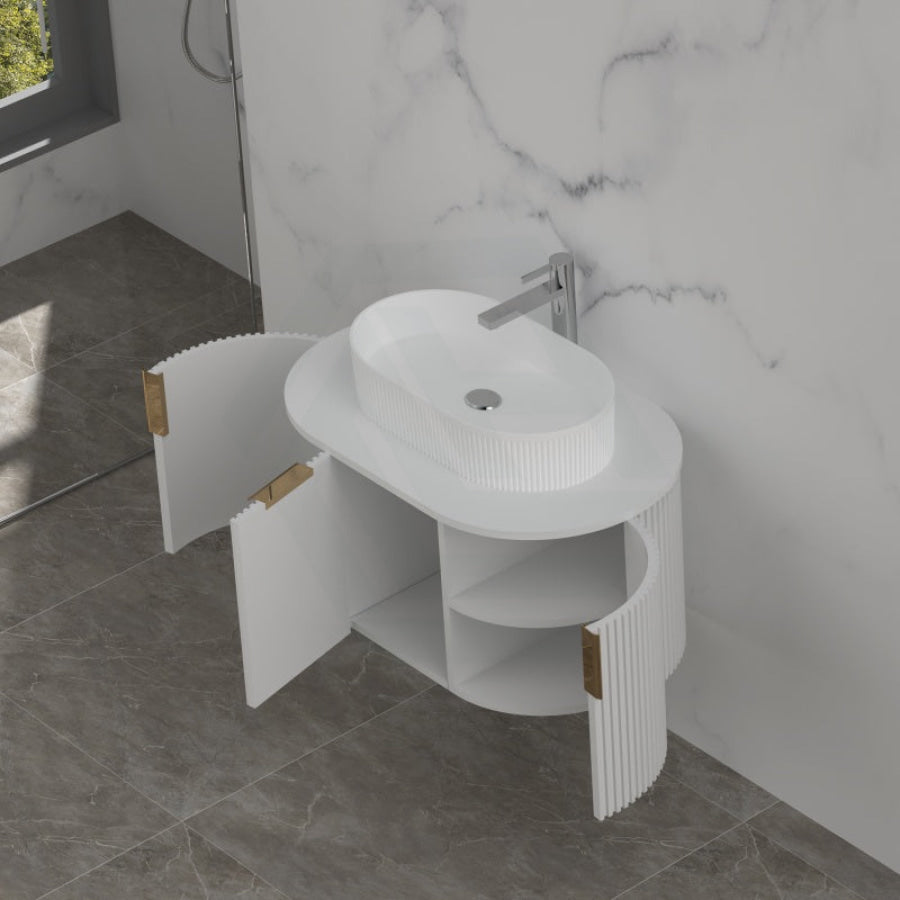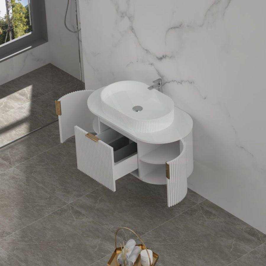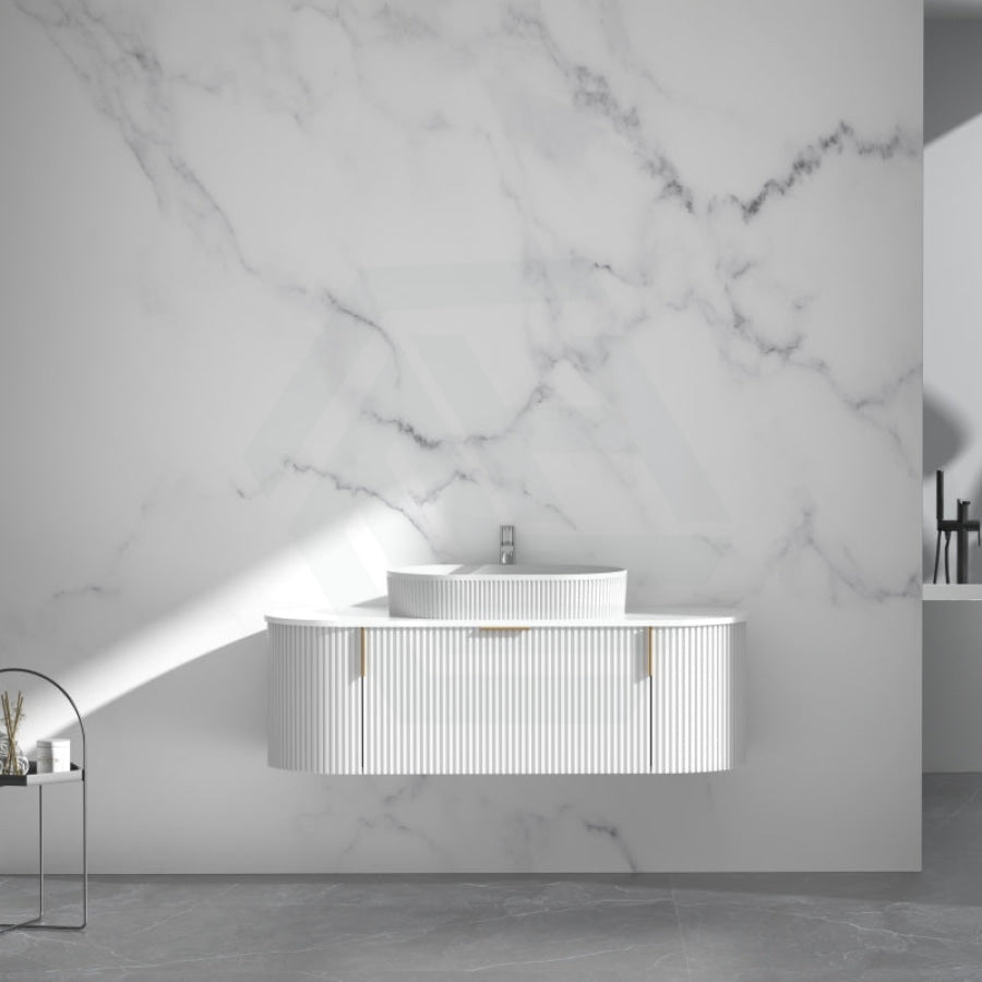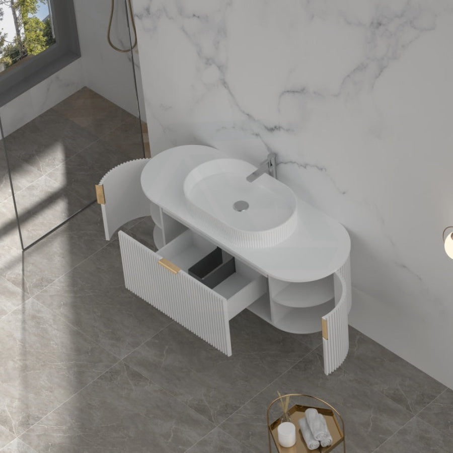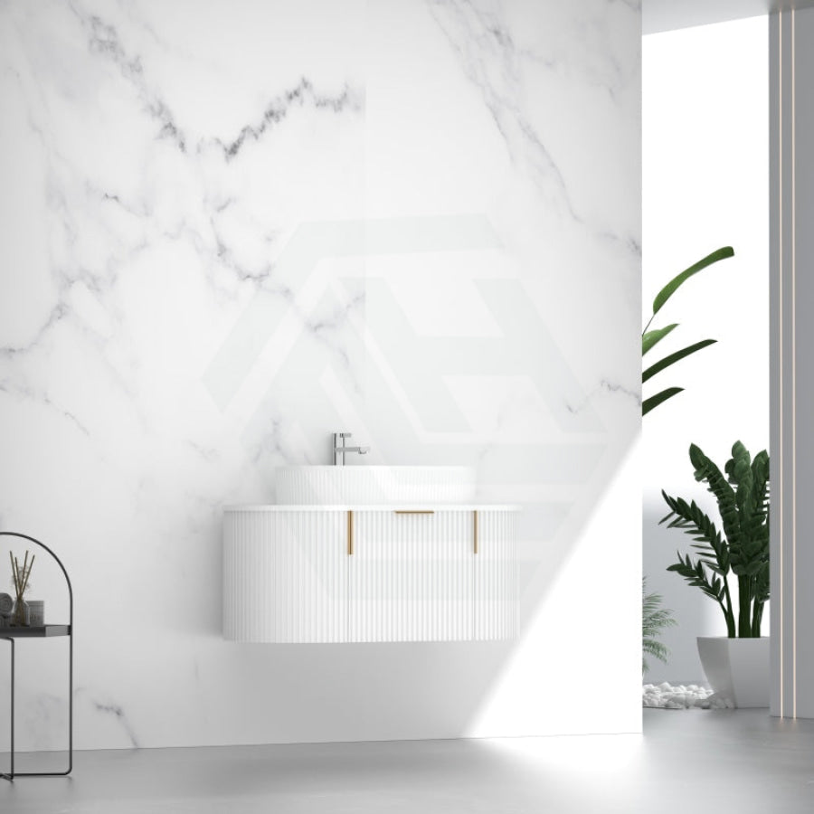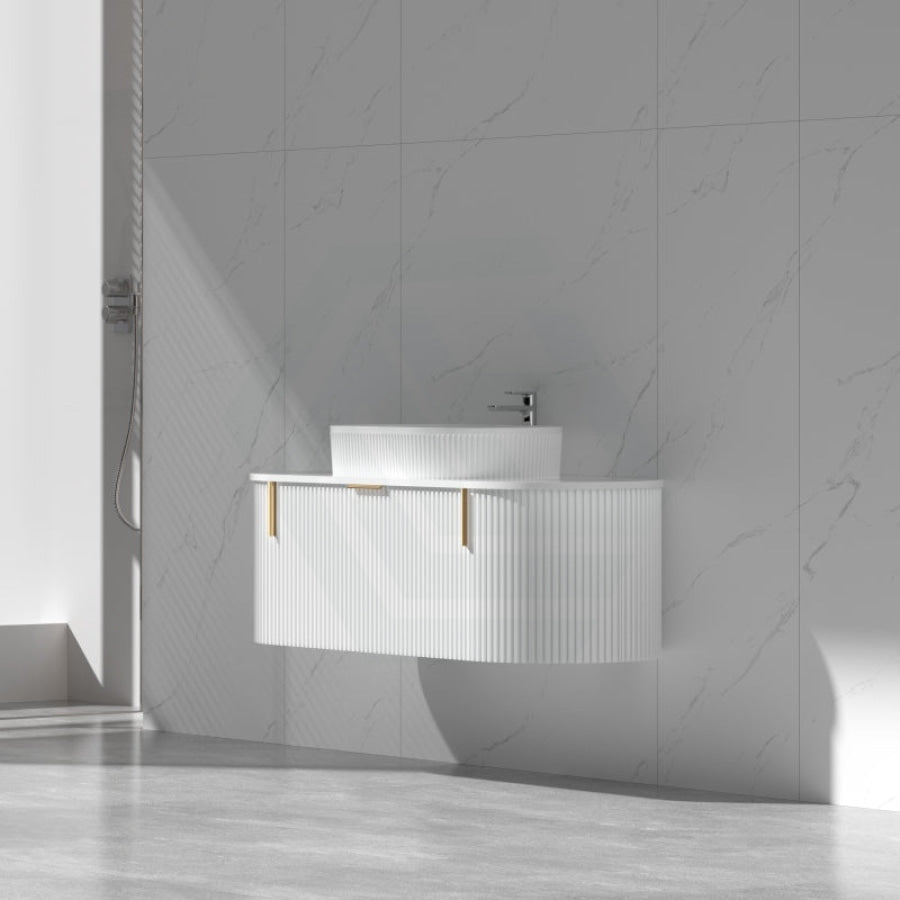 750-1200mm Carysil Matt White Plywood Wall Hung Floating Vanity Fluted with Stone Top brings comfort and function together in the bathroom, equipped with soft closing design.