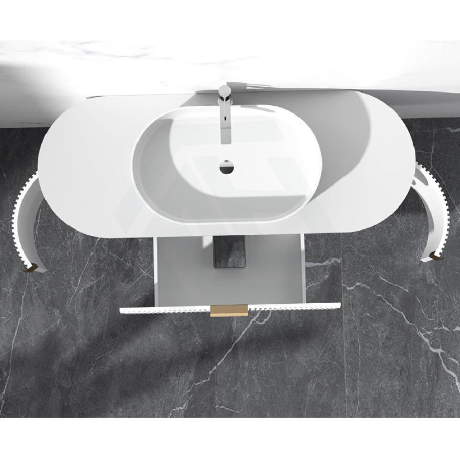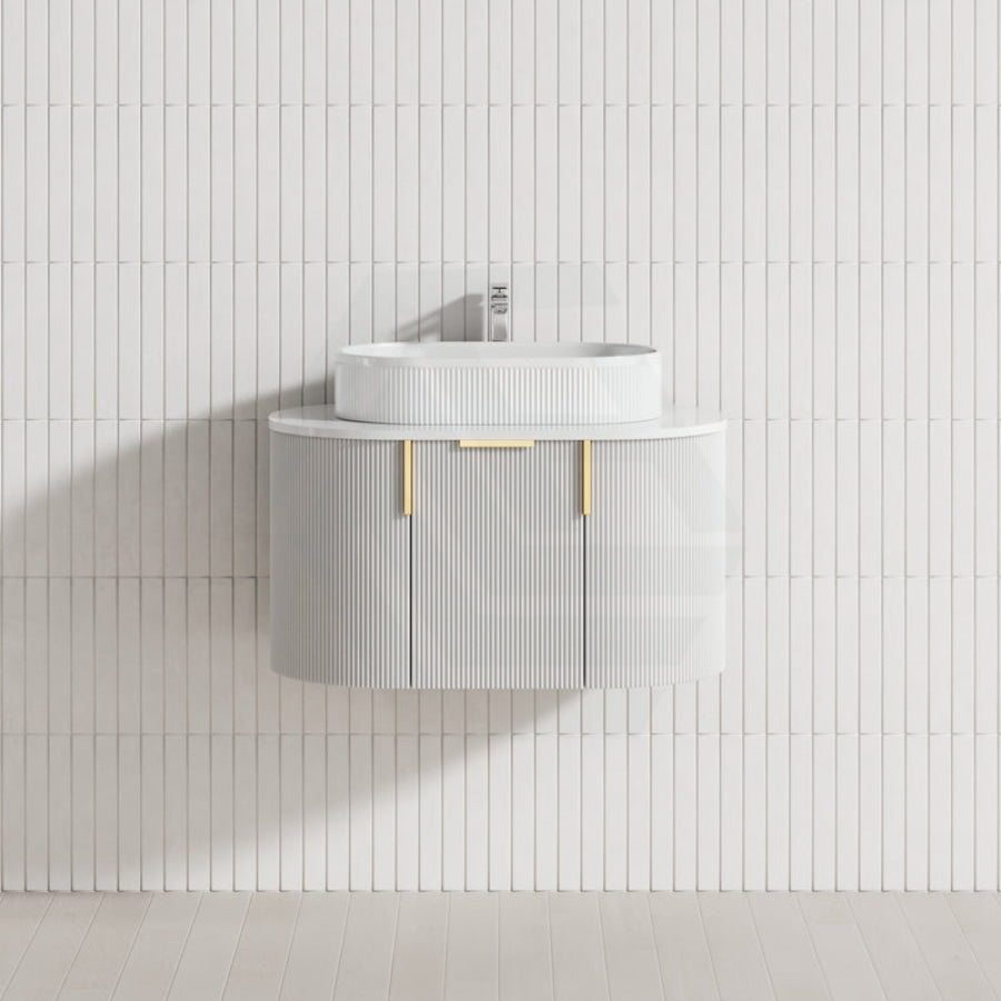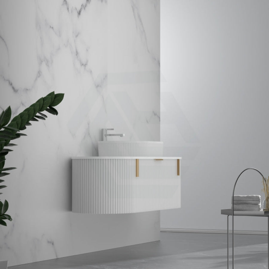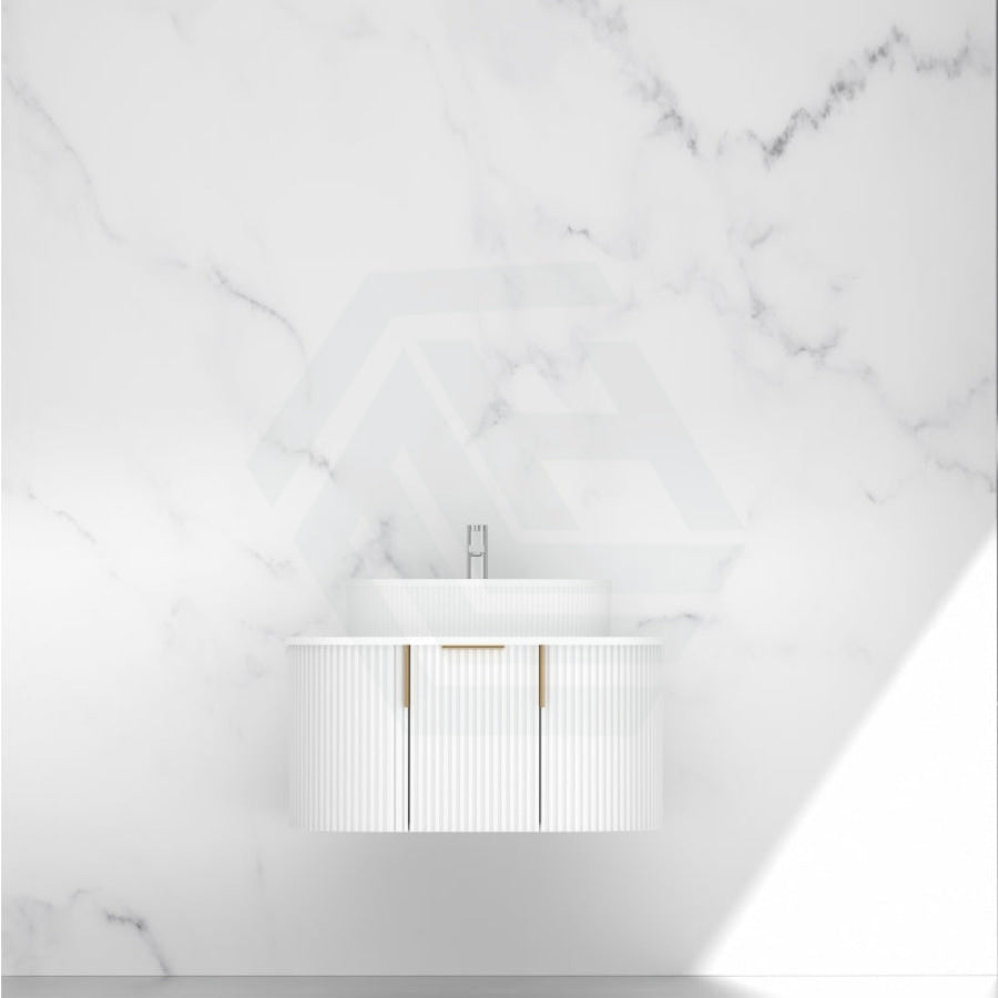 750-1200mm Carysil Matt White Plywood Wall Hung Floating Vanity Fluted 12 O'clock/NO Tap Hole with Center Waste Hole Stone Top Brushed Gold Handle