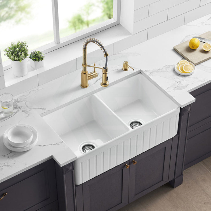 The 828x450x255mm Gloss White Greenwich Fireclay Farmhouse Sink Double Bowls Kitchen Laundry Sink would give an easy-to-clean and elegant addition to your kitchens/laudries.