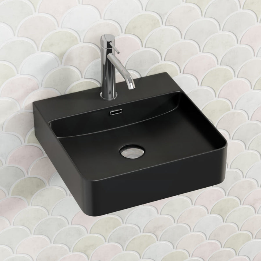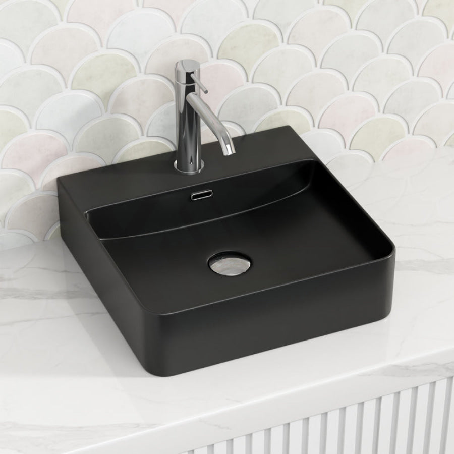 The 420x420x120mm Above Counter / Wall Hung Square Matt White/Matt Black Ceramic Basin would give a high-quality and elegant addition to any bathroom.