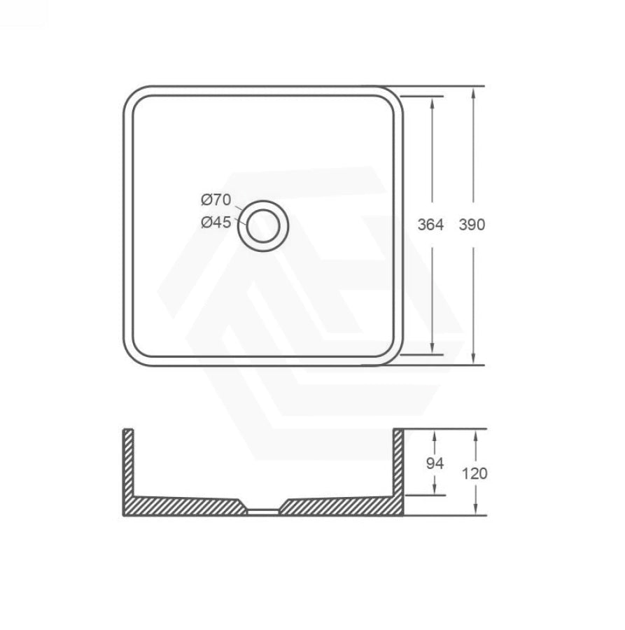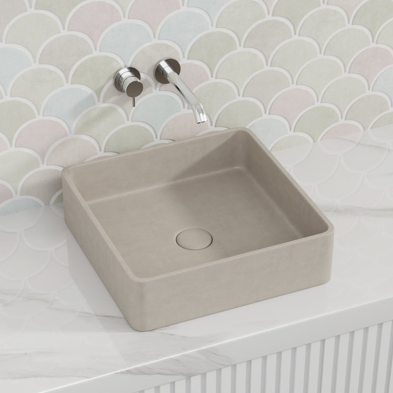 This 390x390x120mm square above-counter basin combines modern concrete craftsmanship with practicality. Designed to sit elegantly atop your vanity, it includes a matching pop-up waste for seamless installation. Available in various colors, it offers both durability and style, making it an ideal choice for contemporary bathrooms requiring a robust yet refined basin solution.