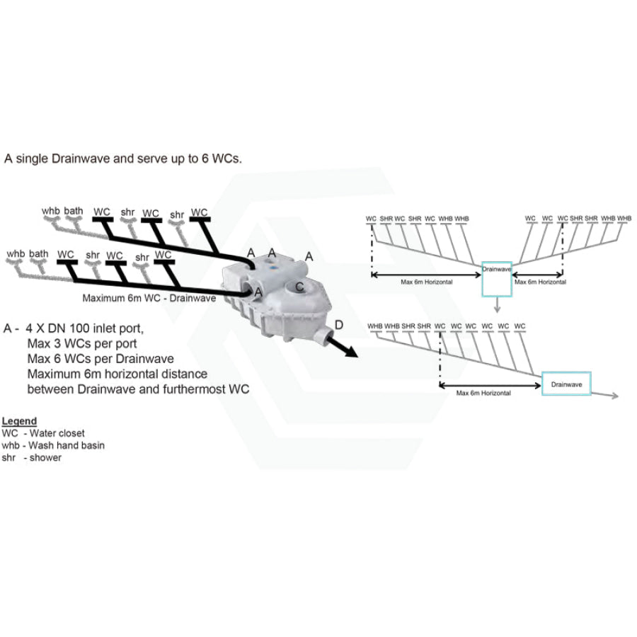 Maximum 6m horizontal distance between drainwave and furthermost toilet