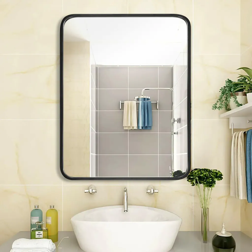 This black aluminum framed rectangle bathroom wall mirror features a minimalist design with smooth rounded corners, creating a softer and more refined visual effect. Made with high-definition glass and a durable aluminum frame, it is resistant to discoloration and suitable for humid environments. The mirror can be wall mounted either vertically or horizontally, making it ideal for bathrooms, bedrooms, living rooms, or hallways while enhancing light and visual space.