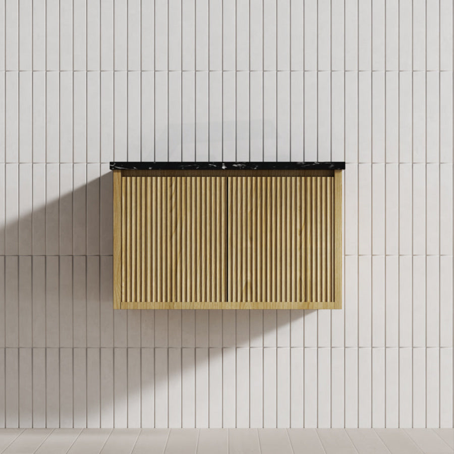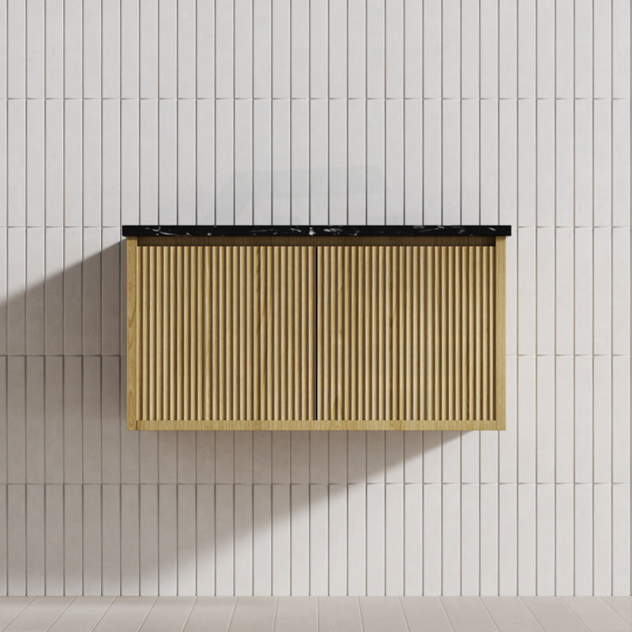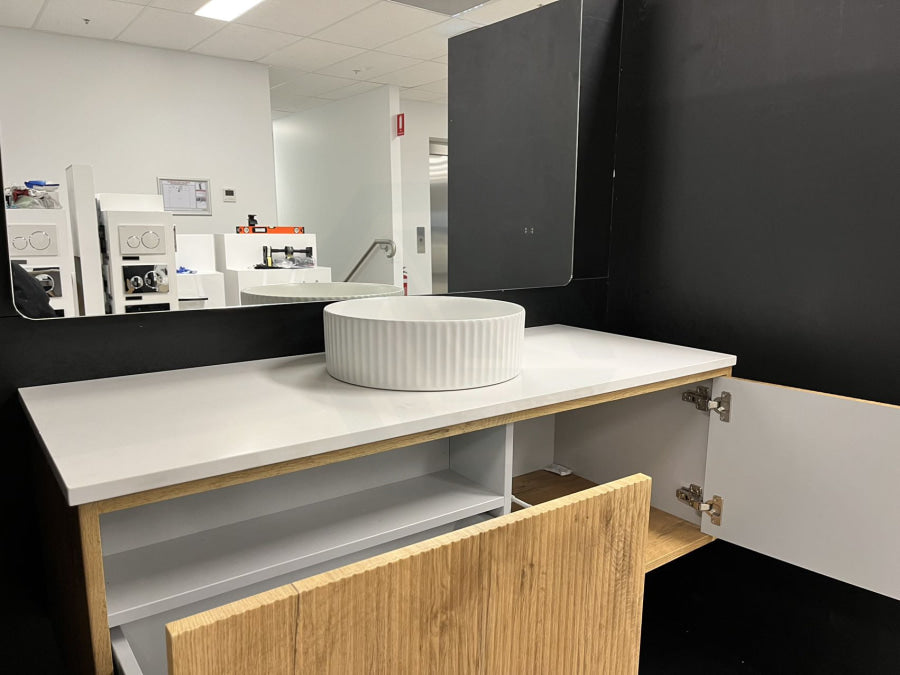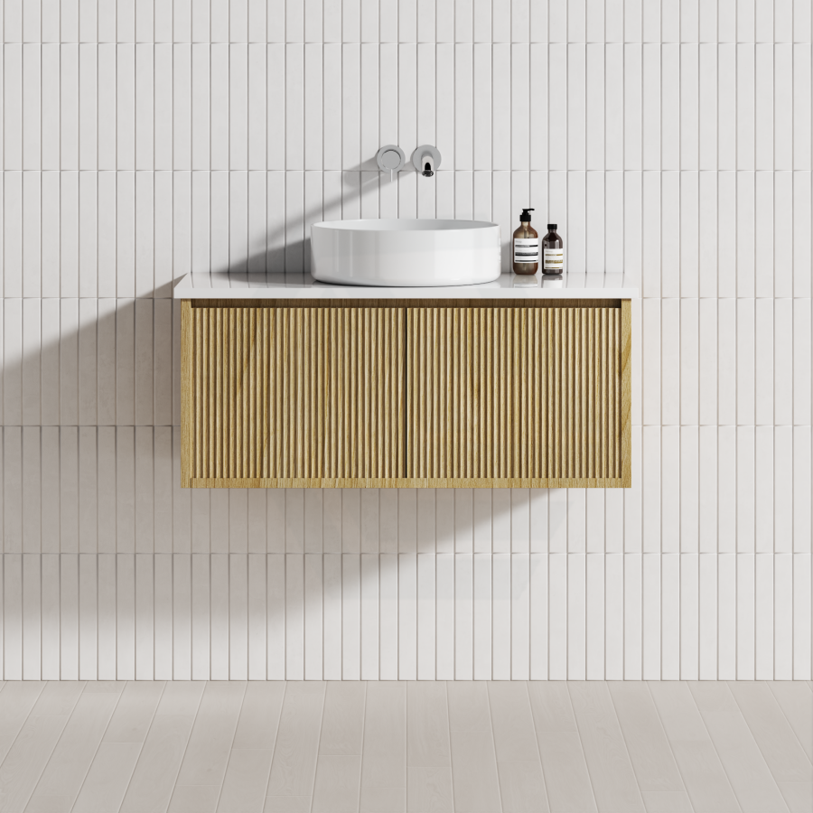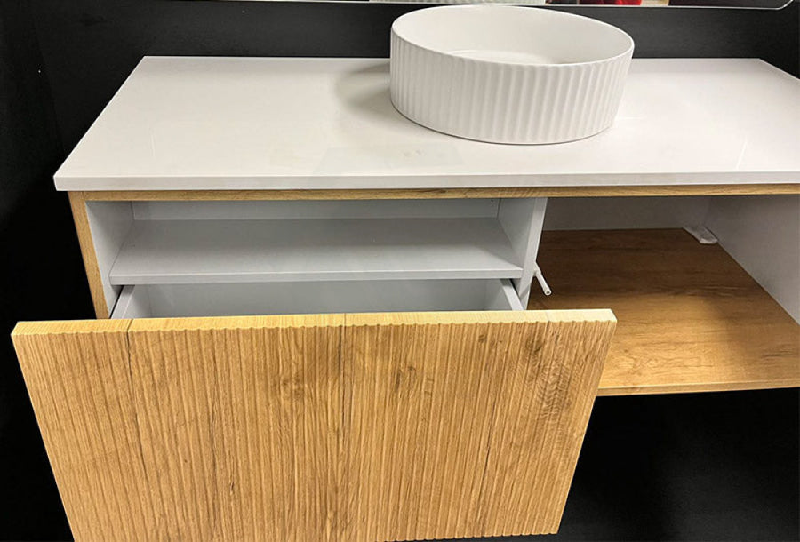 Experience luxury in your bathroom with the Bellevue wall-hung vanity cabinet. Crafted from Prime Oak Woodgrain, with a thermolaminated V-Groove finish, this exquisite statement piece offers both style and functionality. Push-to-open drawers and internal shelving provide ample storage space. A 40mm Box Trap & Space Saver Kit is included to suit any water outlet. Available in five sizes from 600-1500mm to match any space. Mix and match with a variety of stone tops for a custom look.