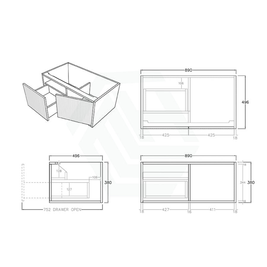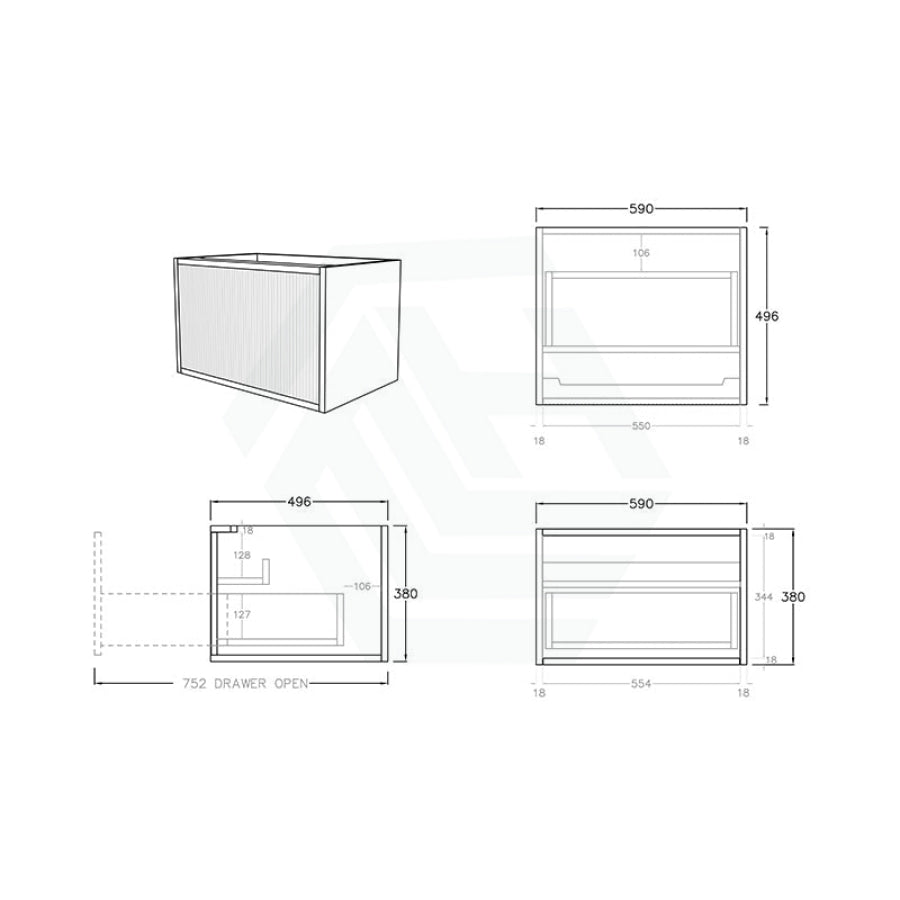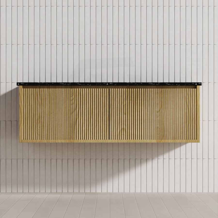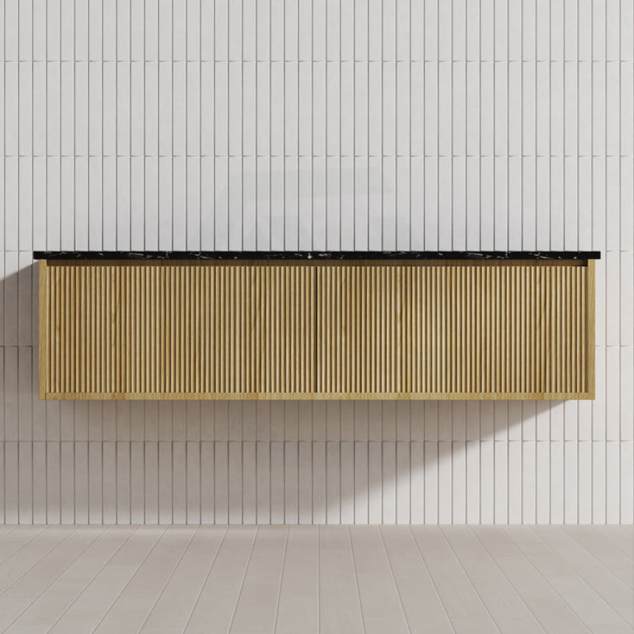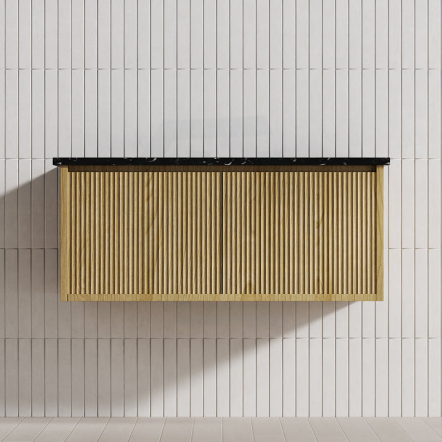 Experience luxury in your bathroom with the Bellevue wall-hung vanity cabinet. Crafted from Prime Oak Woodgrain, with a thermolaminated V-Groove finish, this exquisite statement piece offers both style and functionality. Push-to-open drawers and internal shelving provide ample storage space. A 40mm Box Trap & Space Saver Kit is included to suit any water outlet. Available in five sizes from 600-1500mm to match any space. Mix and match with a variety of stone tops for a custom look.