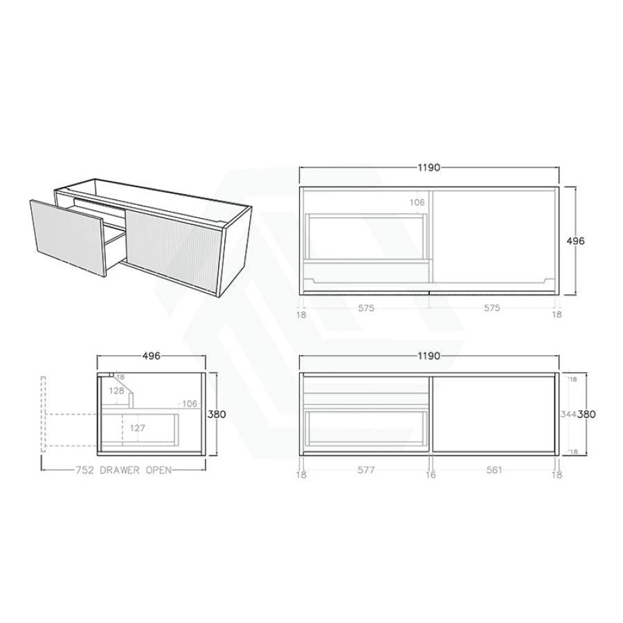 - 1200mm- 1190*496*380mm, coming with 1-2 centre waste holes