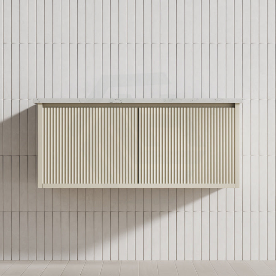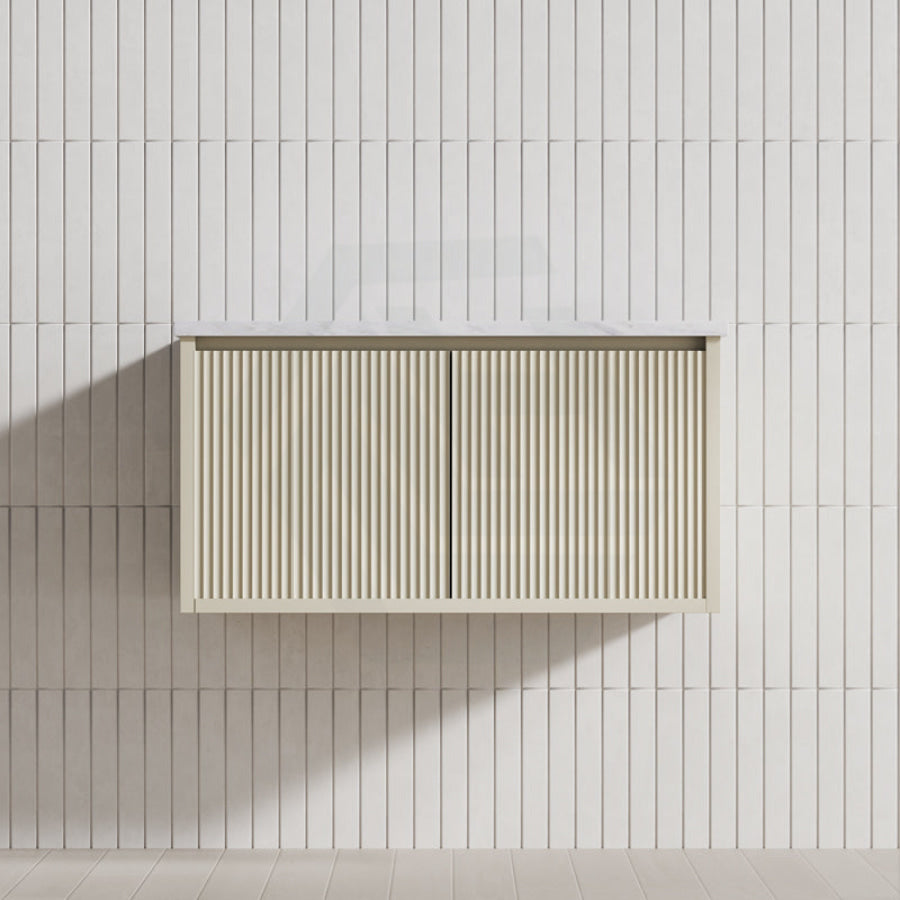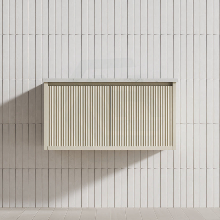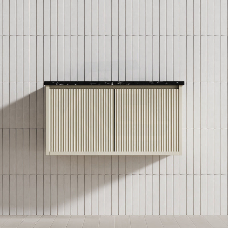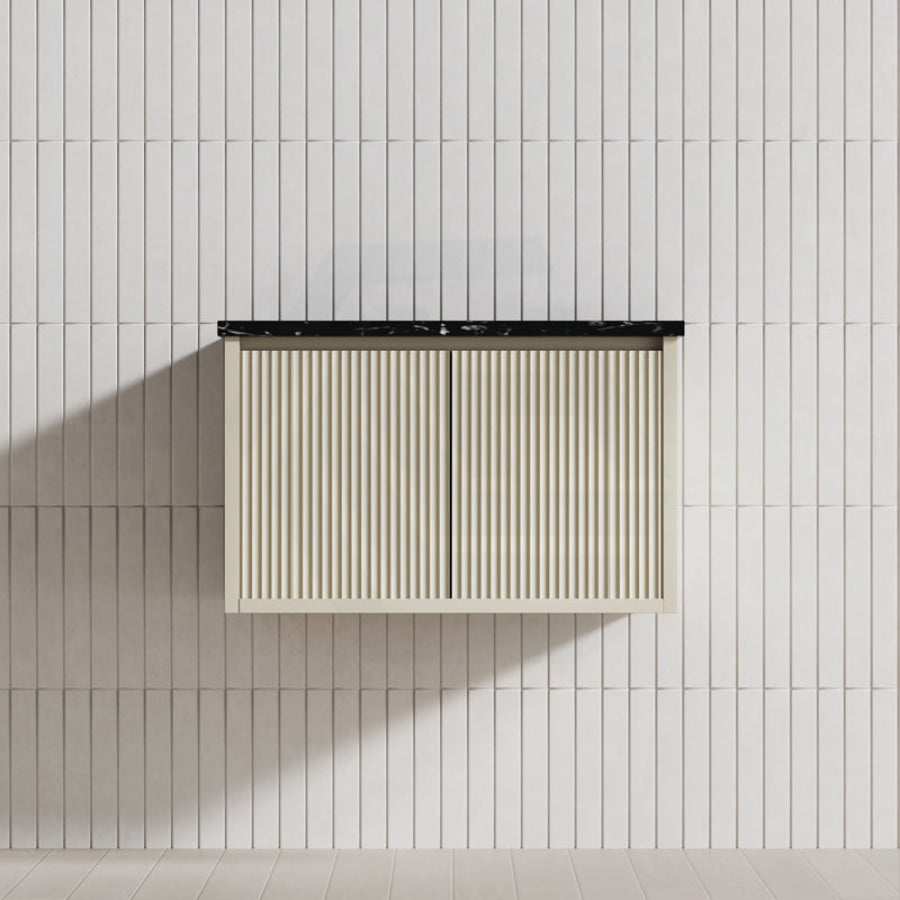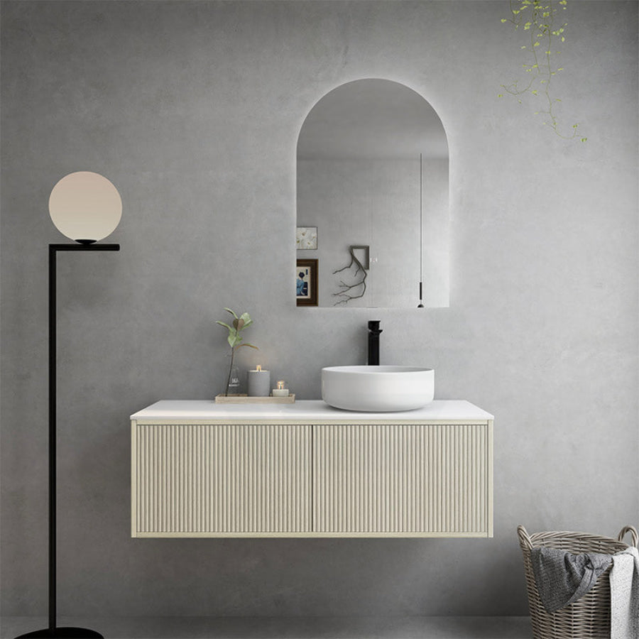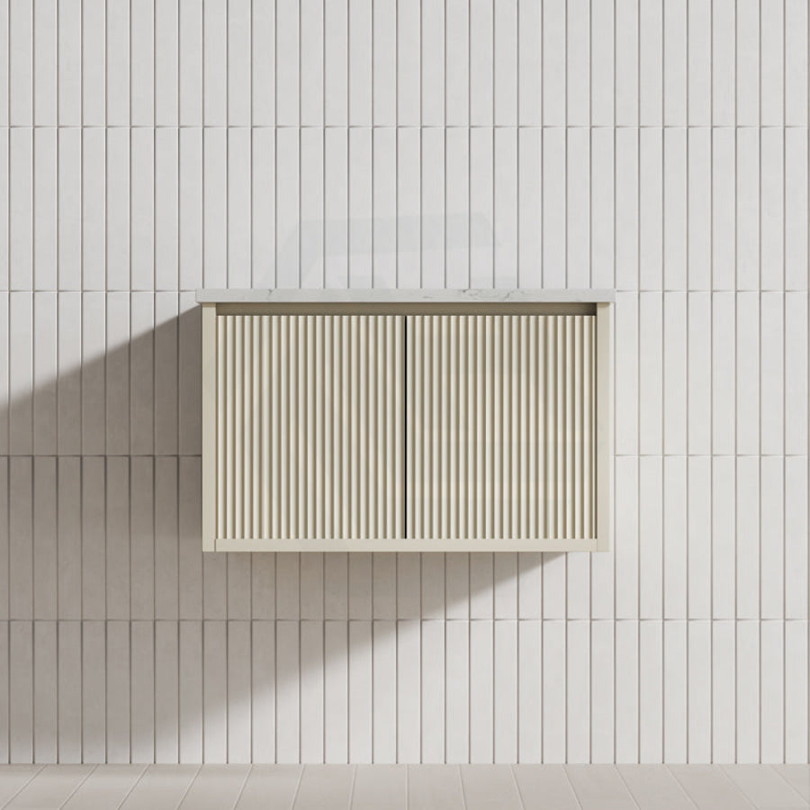 Experience luxury in your bathroom with the Bellevue wall-hung vanity cabinet. Crafted from Coastal Oak Woodgrain, with a thermolaminated V-Groove finish, this exquisite statement piece offers both style and functionality. Push-to-open drawers and internal shelving provide ample storage space. A 40mm Box Trap & Space Saver Kit is included to suit any water outlet. Available in five sizes from 600-1500mm to match any space. Mix and match with a variety of stone tops for a custom look.