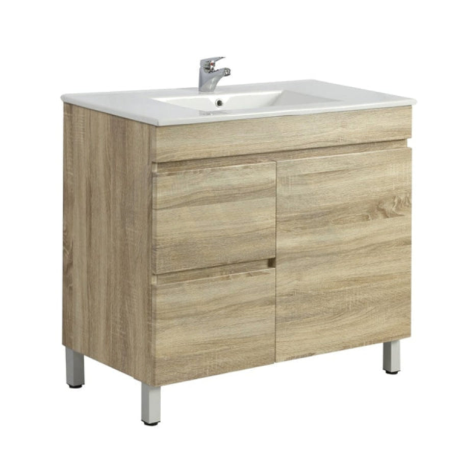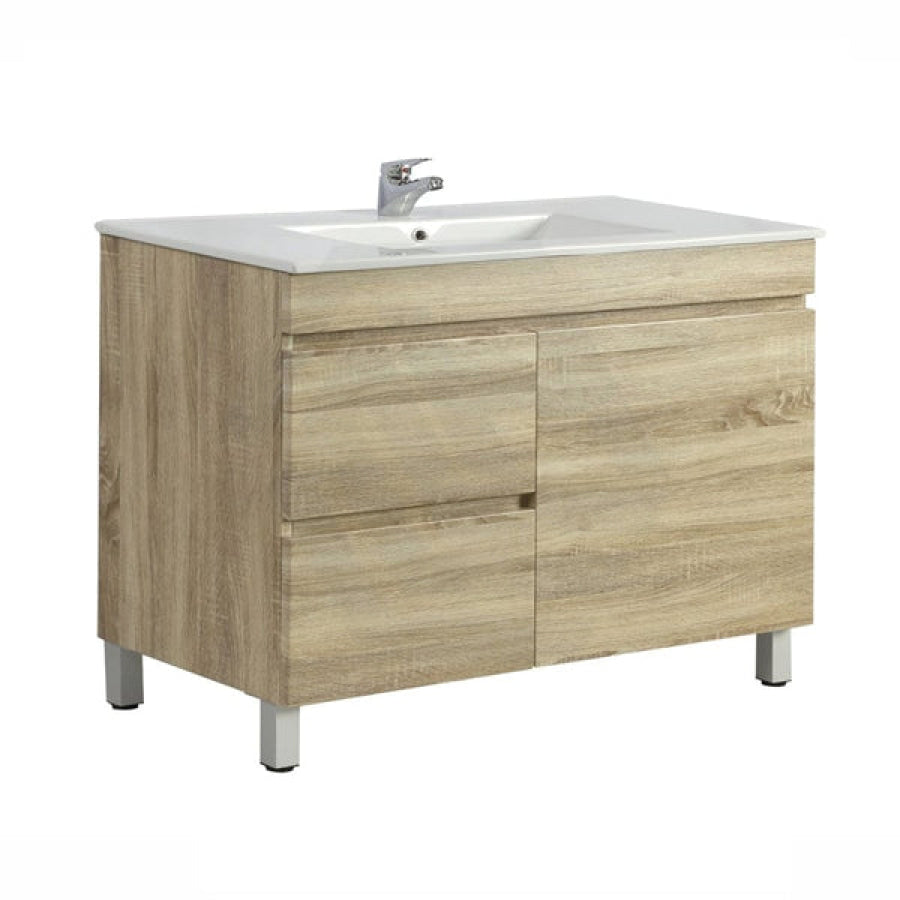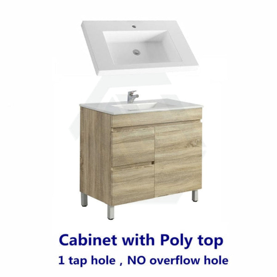 - Freestanding vanity coming with an optional ceramic/poly top.