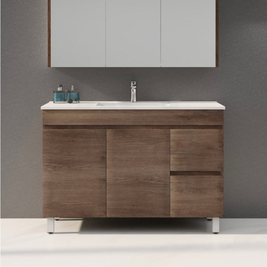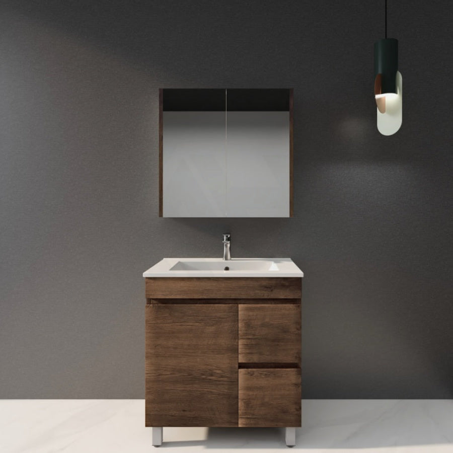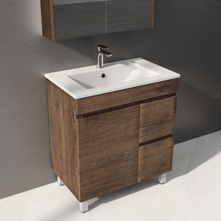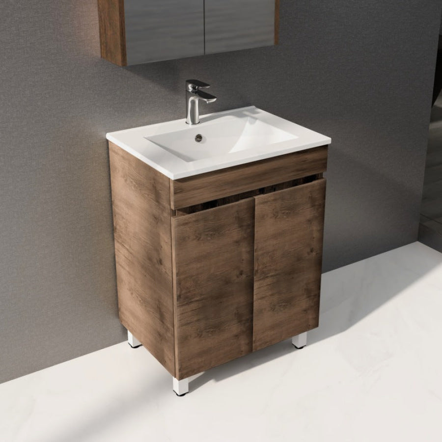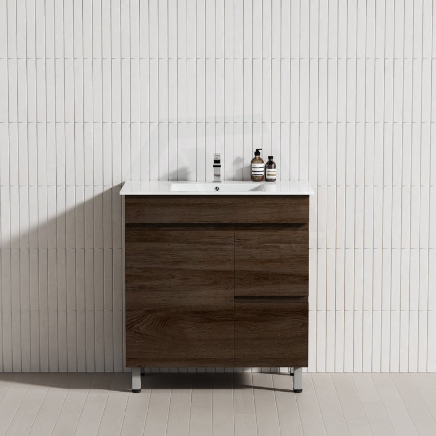 600-1500mm Berge Freestanding Bathroom Floor Vanity Dark Oak Wood Grain PVC Filmed Cabinet ONLY & Ceramic/Poly Top Available