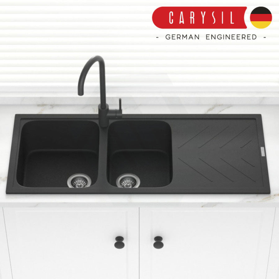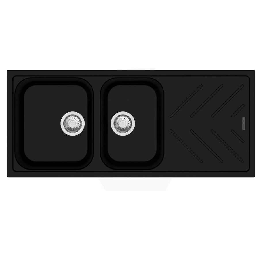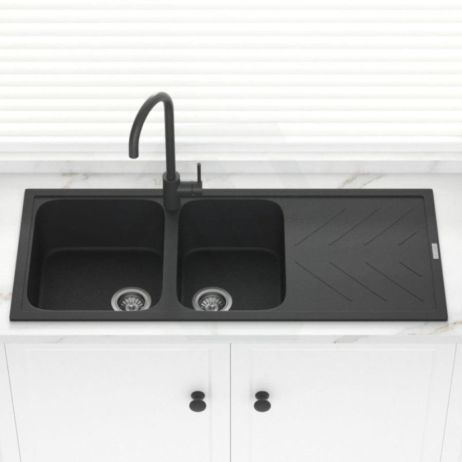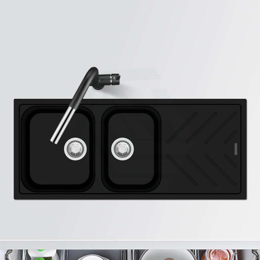 The 1160x500x200mm Black Granite Quartz Stone 1 and 3/4 Kitchen Sink Double Bowls Drainboard Topmount would give an easy-to-clean and elegant addition to any kitchen.