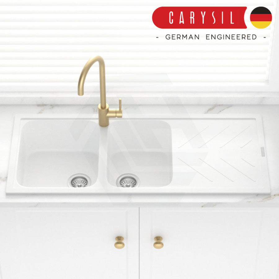 The 1160x500x200mm White Granite Quartz Stone 1 and 3/4 Kitchen Sink Double Bowls Drainboard Topmount would give an easy-to-clean and elegant addition to any kitchen.