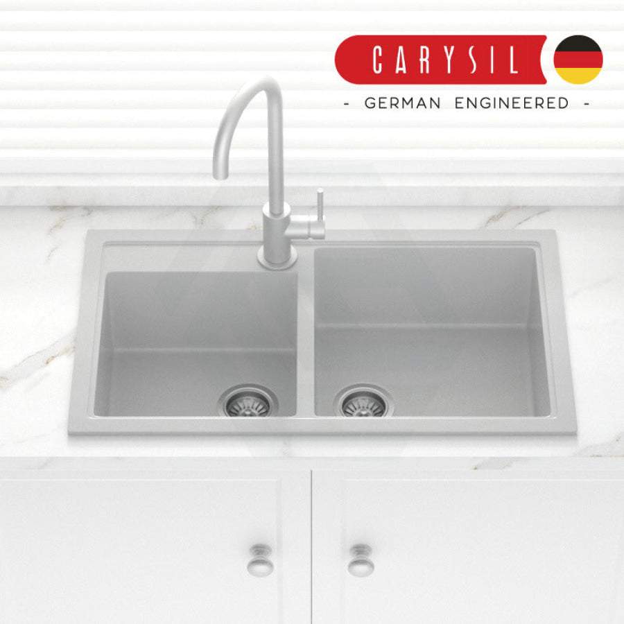 The 860x500x205mm Carysil Concrete Grey Double Bowl Granite Kitchen Sink Top/Flush/Under Mount would give an easy-to-clean and elegant addition to any kitchen.