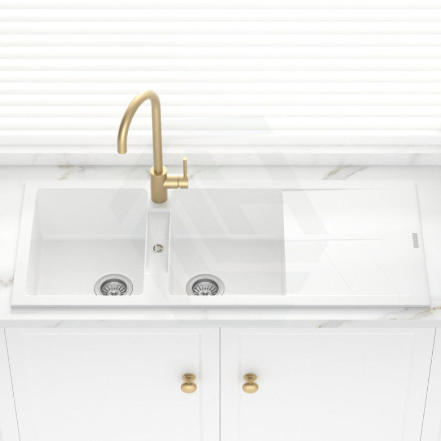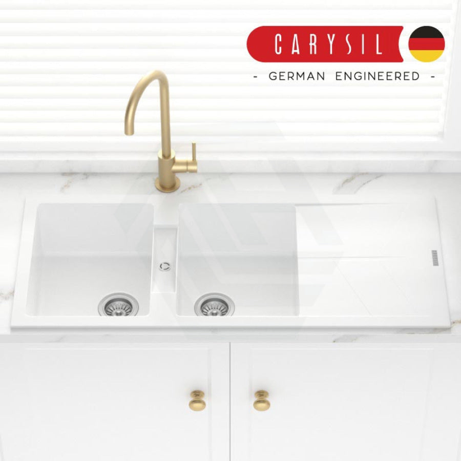 The 1160x500x210mm Carysil White Double Bowl Drainer Board Granite Kitchen Sink Top/Flush Mount would give an easy-to-clean and elegant addition to any kitchen.