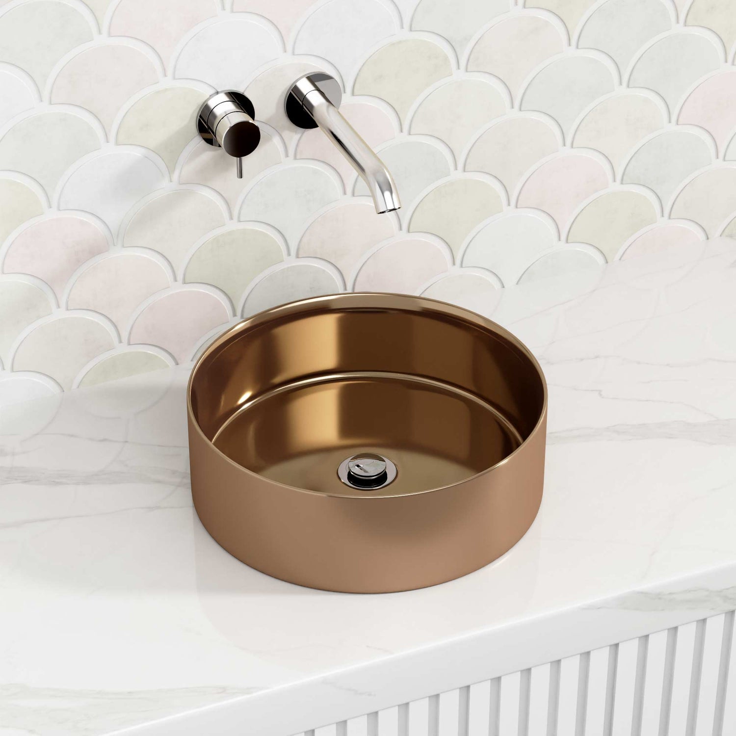 This round ceramic above-counter basin is available in three sizes—346mm, 352mm, and 355mm—and offers variant color options to suit various bathroom designs. Crafted from durable ceramic, it provides a sleek, easy-to-clean surface that enhances both aesthetics and functionality. Ideal for modern washroom setups, this basin installs elegantly above the counter, delivering a refined, professional finish while optimizing countertop space.