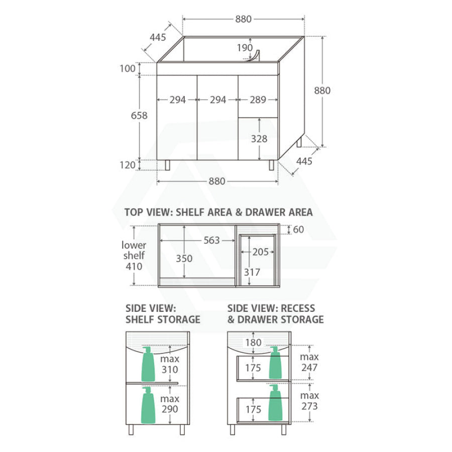 - 880mm tall cabinet (not including basin-top)