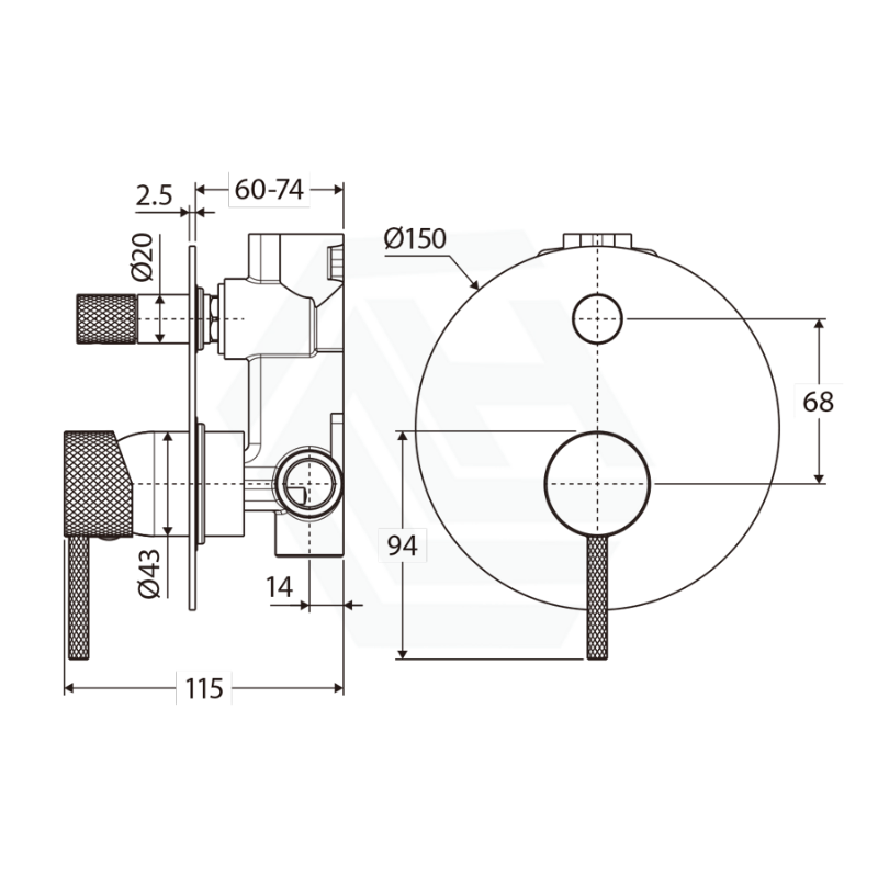 The Fienza Axle Wall Diverter Mixer combines striking industrial design with robust construction. Its unique cross-hatched handles and clean pin lever create a distinctive architectural statement, while the substantial large round plate provides a solid foundation. Crafted entirely from solid brass, this mixer is built for enduring performance in your shower or bath area.