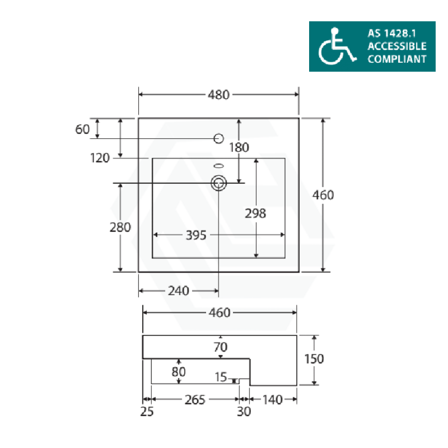Installation Note: Due to the nature of ceramic as a material, small variations in size and shape do occur. Ensure that the measurements of the purchased basin are checked physically, BEFORE cutting any counter-top. Specification drawings are a GUIDE ONLY. Fienza will not be held liable for any errors made by external parties when cutting counter-tops.