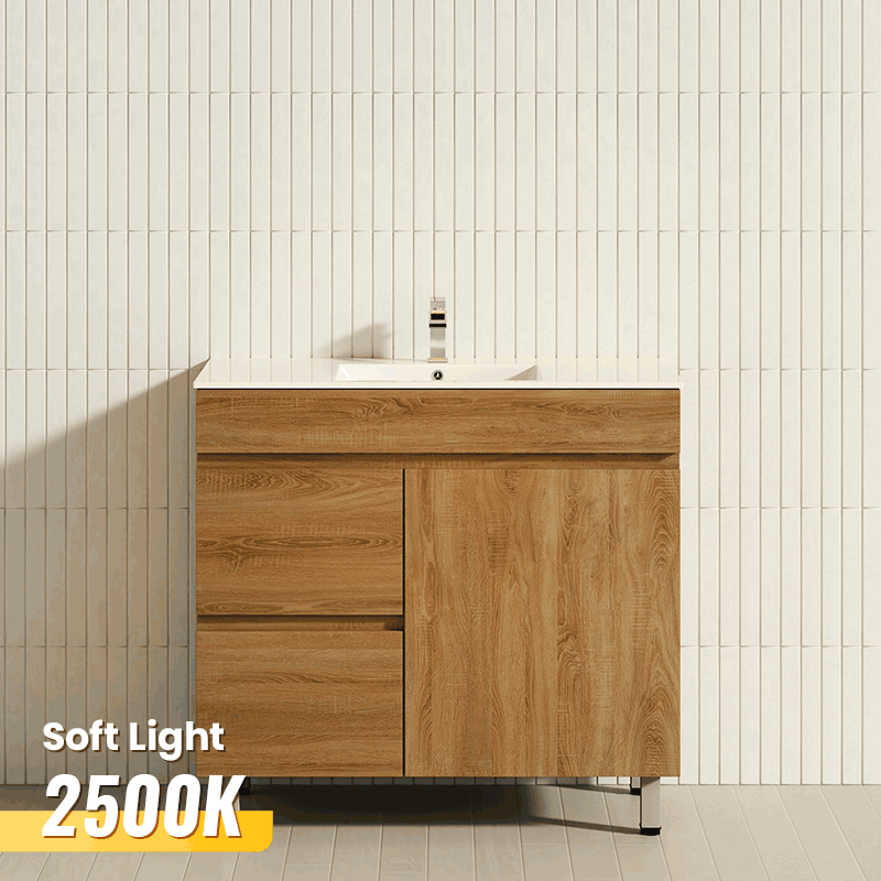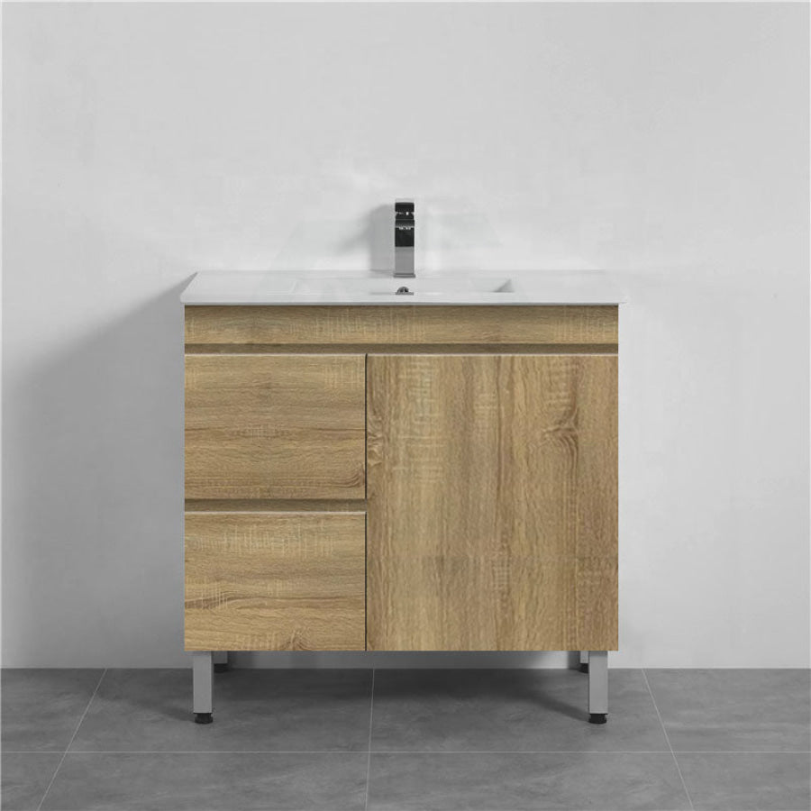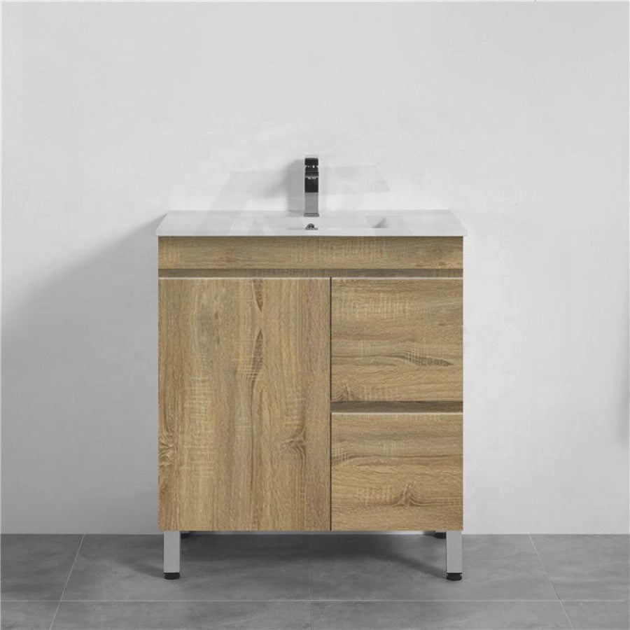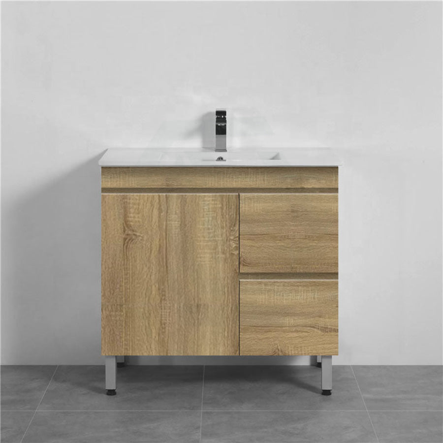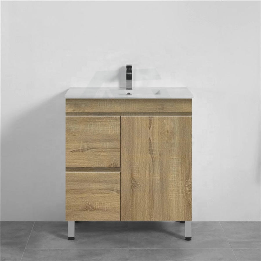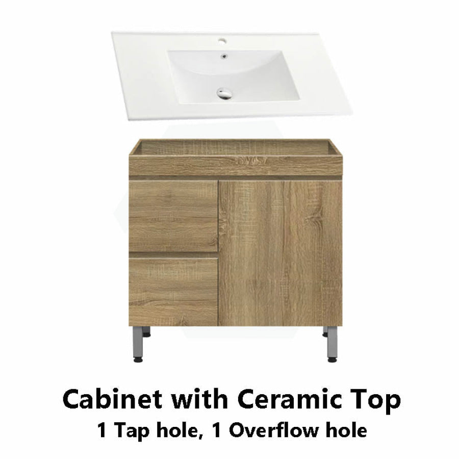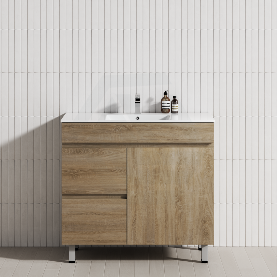 The 600-1500mm Freestanding MDF Vanity Light Oak Finish Left / Right Drawers Cabinet ONLY for Bathroom brings comfort and function together in the bathroom, equipped with soft closing design.