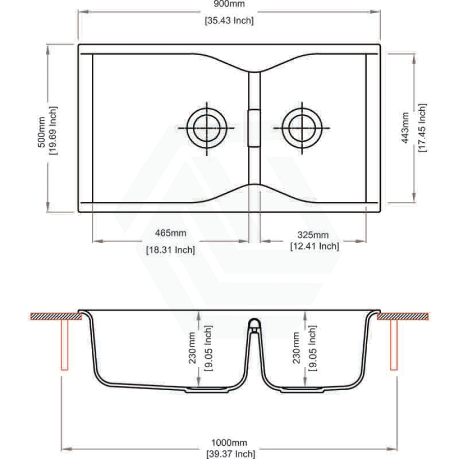 900x500x230mm Red Quartz Granite Double Bowls Sink for Top/Under Mount in Kitchen