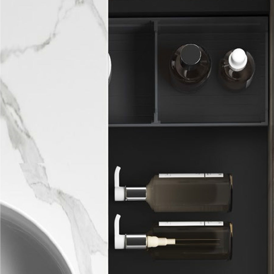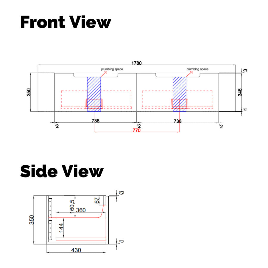 Please note that if you choose to drill holes for the tap at the 10 o'clock and 2 o'clock positions on the stone top, there is a high likelihood of encountering the partition panels inside the cabinet. In such cases, it will be necessary for your plumber to make cuts inside the cabinet.