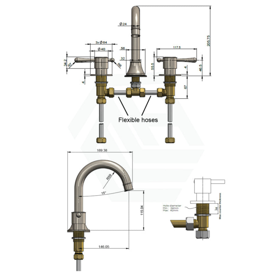 - -Deck mounted quarter turn lever handles with gooseneck spout