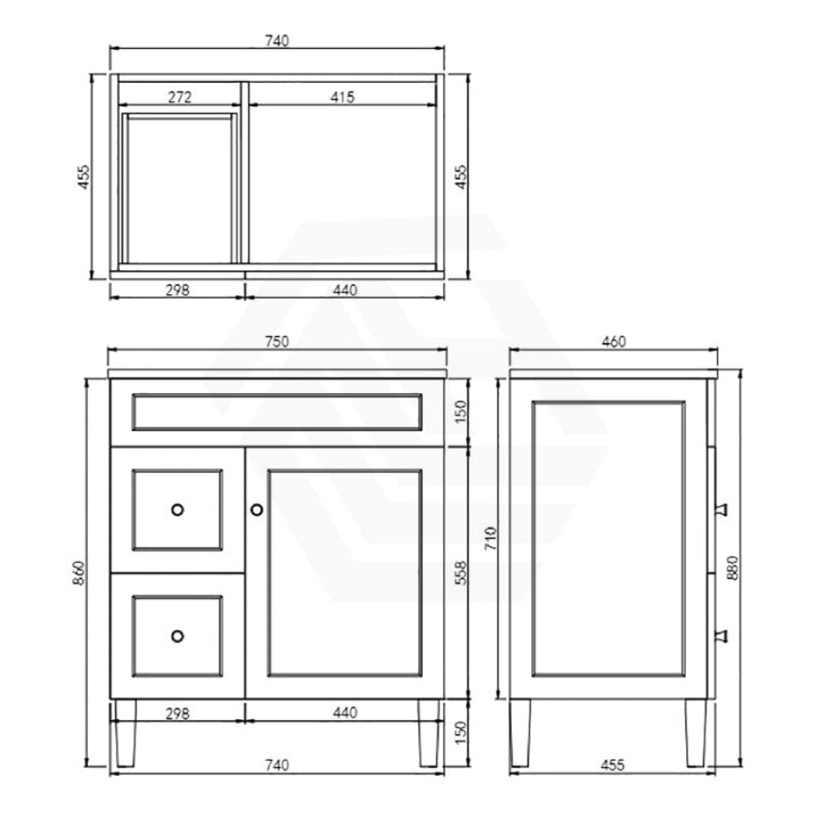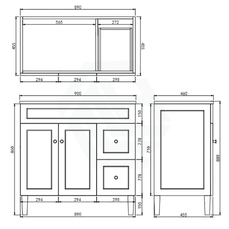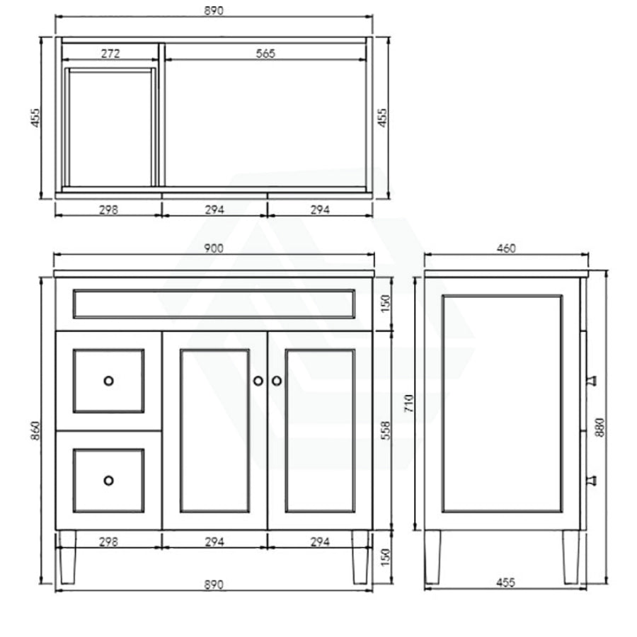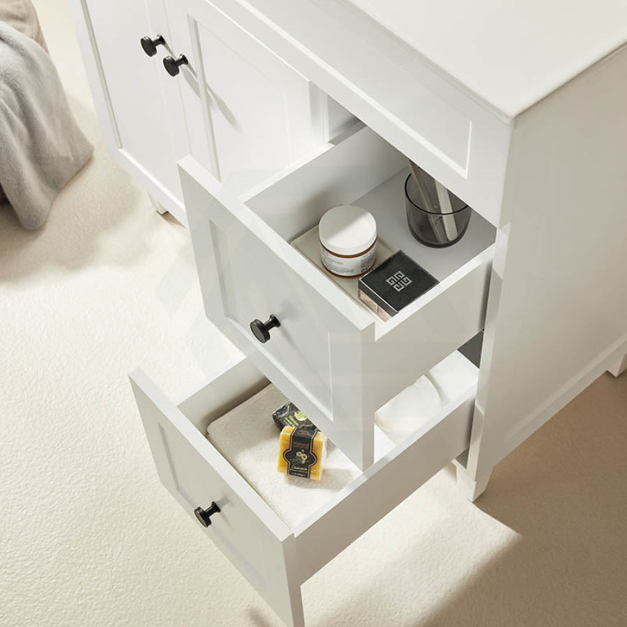 - 600mm Vanity (With soft closing double doors) 750mm Vanity (With double drawers and one door) 900/1200mm Vanity (With double drawers and double doors) 1500mm Vanity (With four drawers and double doors)