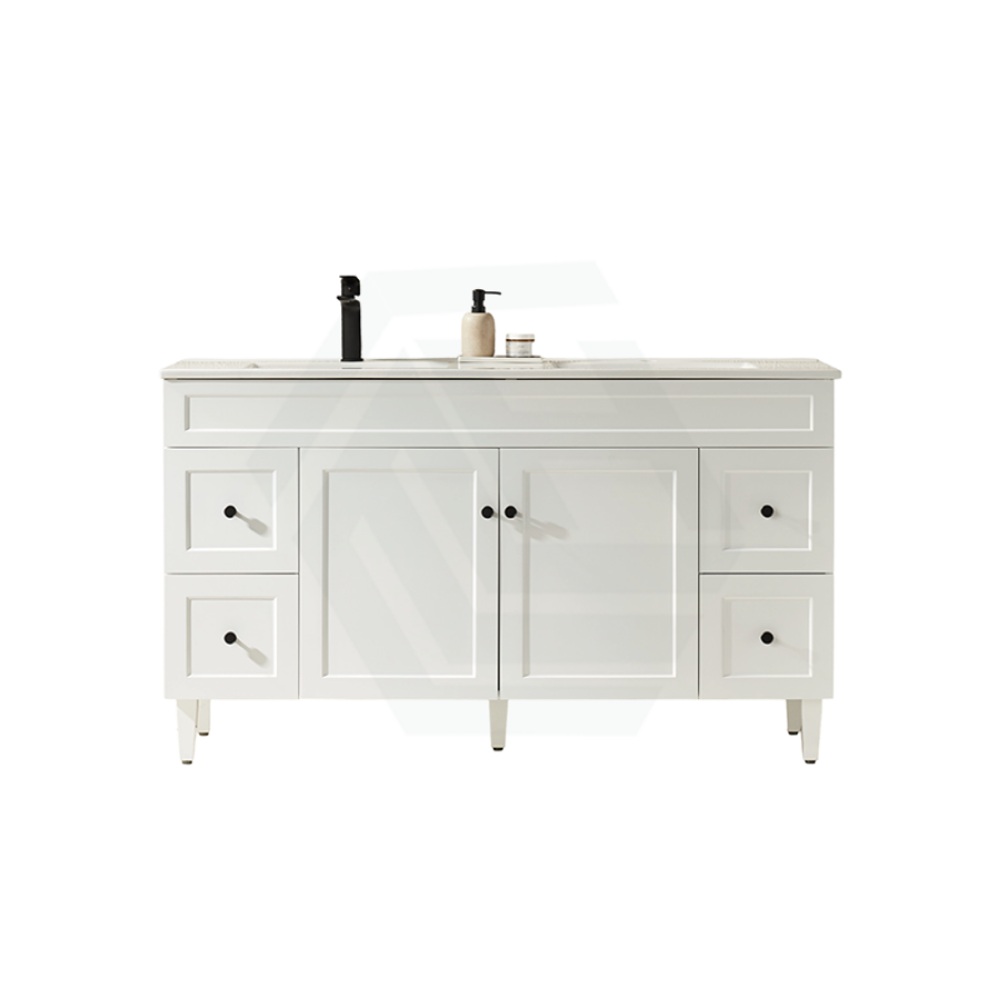 Elevate your bathroom with the versatile and stylish 600-1500mm Harrington Freestanding Vanity with Legs Matt White PVC Cabinet. The Matt White PVC cabinet adds a touch of sophistication, while the ceramic top provides durability. This piece embodies classic design, offering customizable handle options for perfect color coordination, redefining the modern timeless aesthetic in your bathroom. With its spacious design and sturdy legs, this vanity offers both functionality and elegance.
