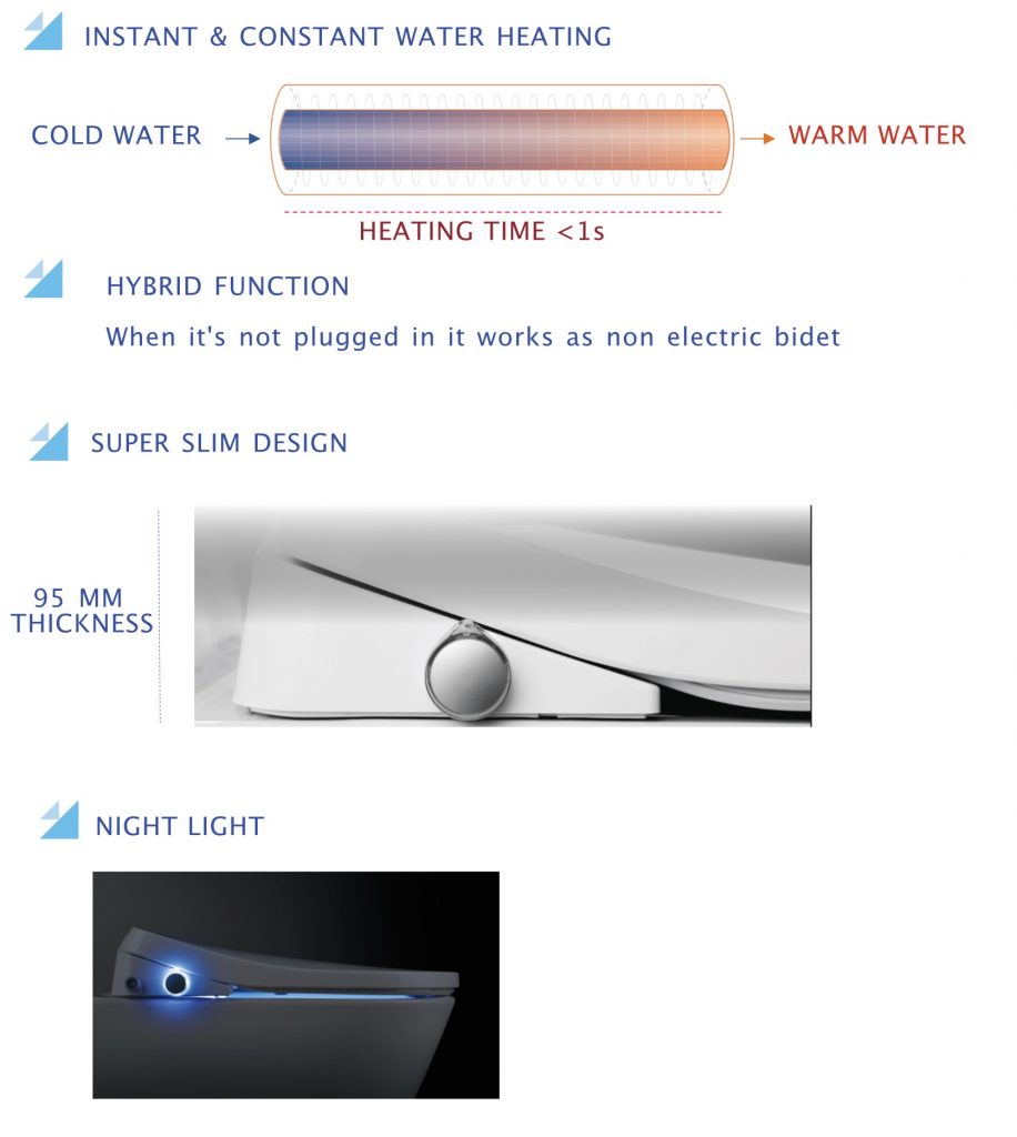 Feminine WashPosterior WashAdjustable Water PressureAdjustable Water TemperatureAdjustable Seat TemperatureHybrid bidet seatSoft ClosingSuper Slim Design only 95 mm height |