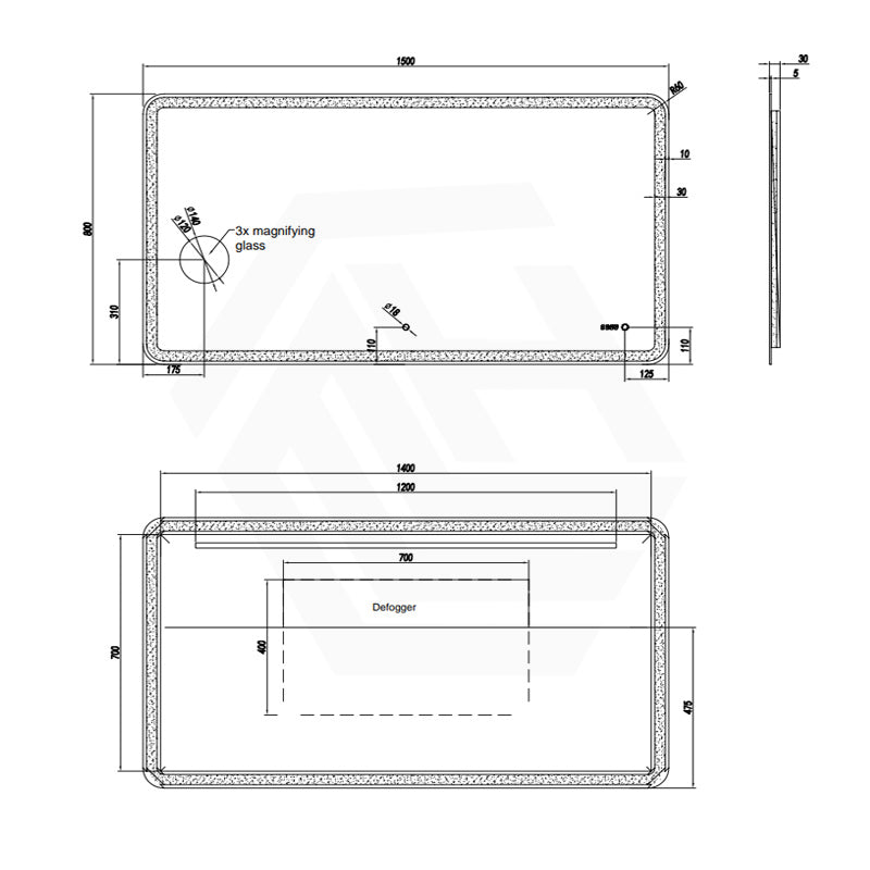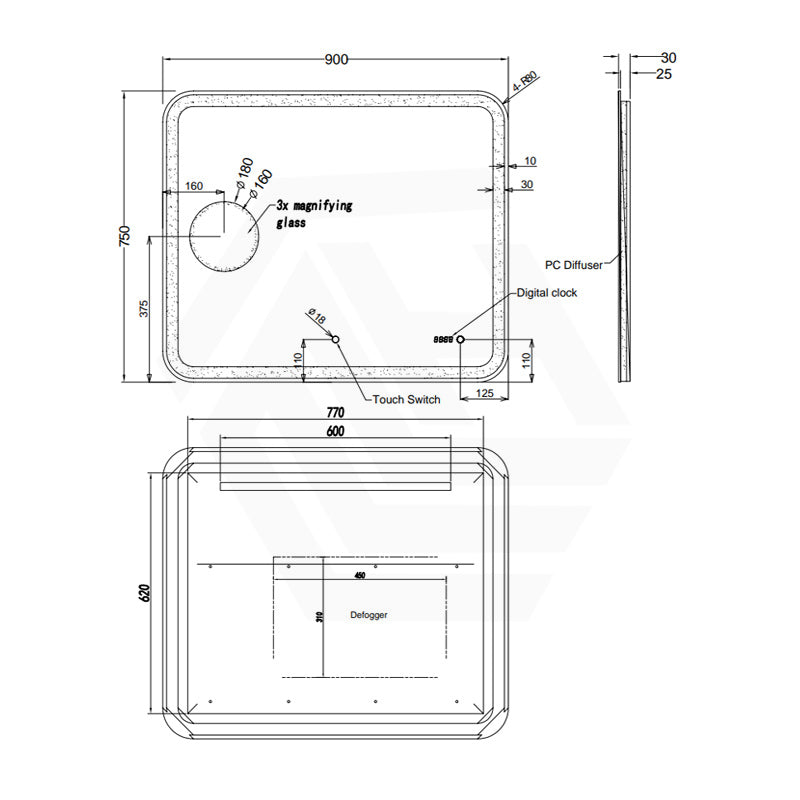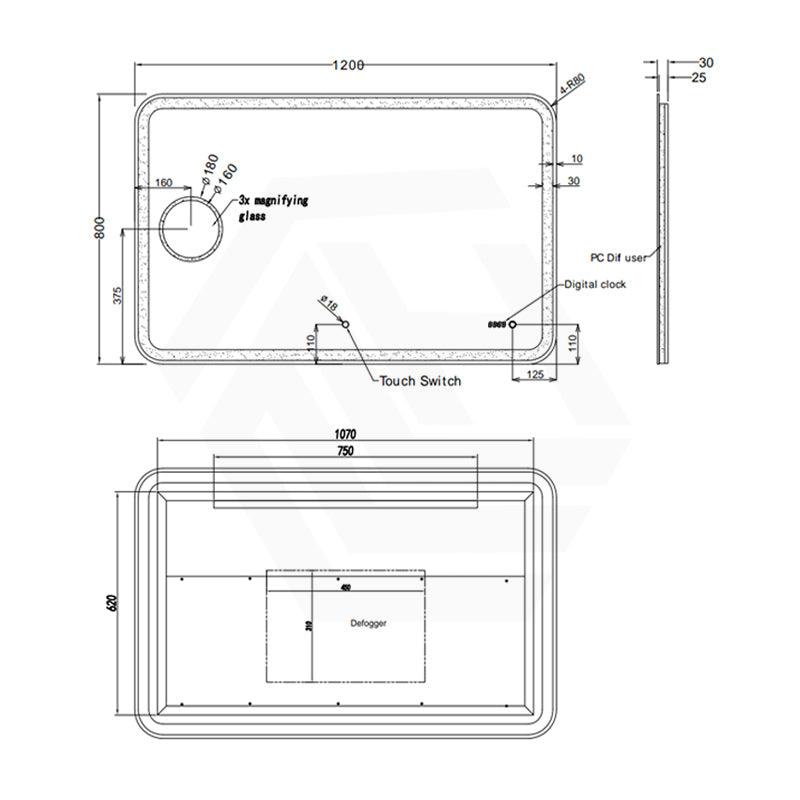 900/1200/1500mm Lamex LED Mirror with Magnifier Digital Clock Horizontal Installation