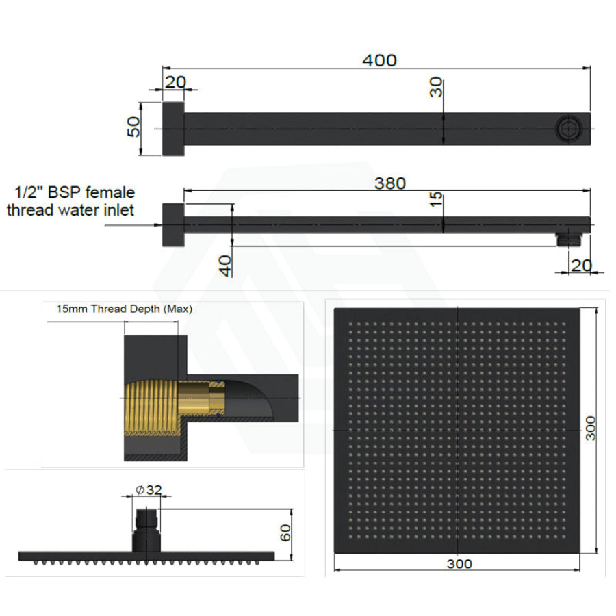 – Female 1/2″ connection in shower arm to suit Australian plumbing