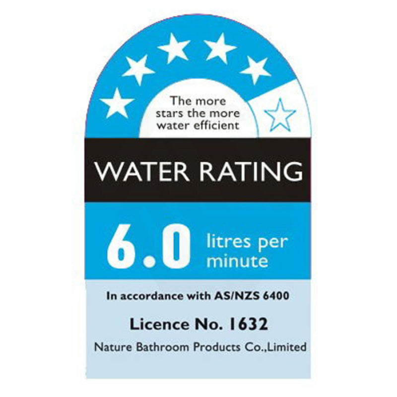 Shower heads have MAXIMUM flow rate of 6 litres per minute, kits have watermark WMKT21090, hoses are standard pressure of 150-350Kpa as per AS/NZS 3662.2006 WELS: 5 Star - 6L/min |