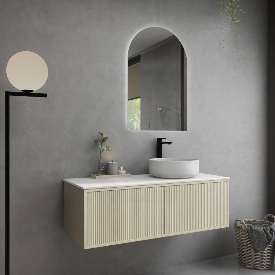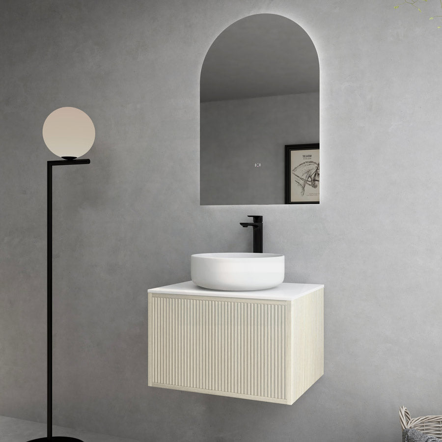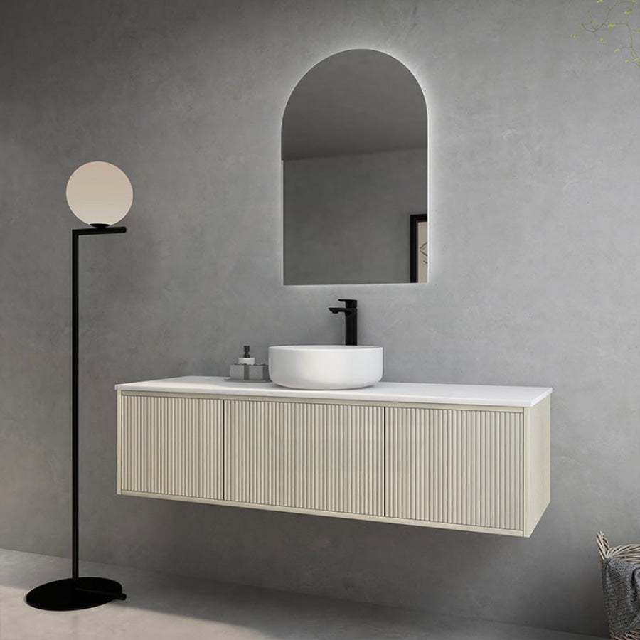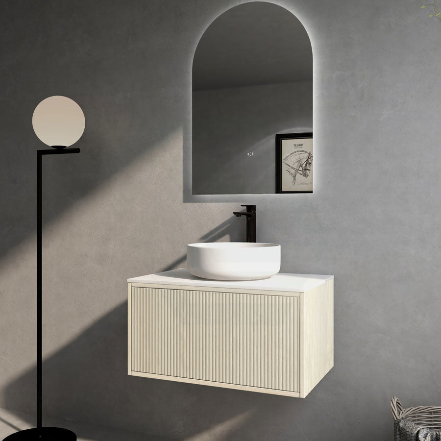 Experience luxury in your bathroom with the Bellevue wall-hung vanity cabinet. Crafted from Coastal Oak Woodgrain, with a thermolaminated V-Groove finish, this exquisite statement piece offers both style and functionality. Push-to-open drawers and internal shelving provide ample storage space. A 40mm Box Trap & Space Saver Kit is included to suit any water outlet. Available in five sizes from 600-1500mm to match any space. Mix and match with a variety of stone tops for a custom look.