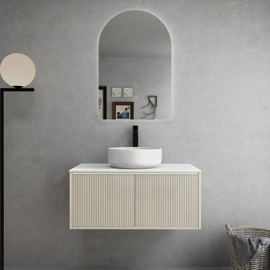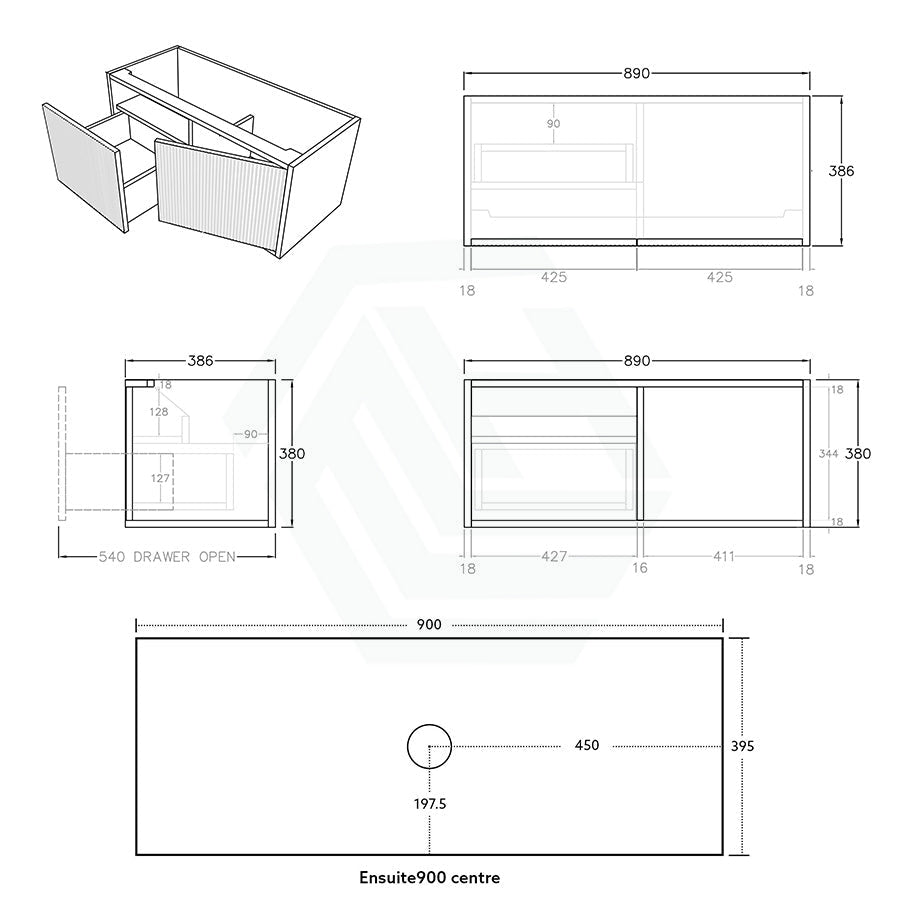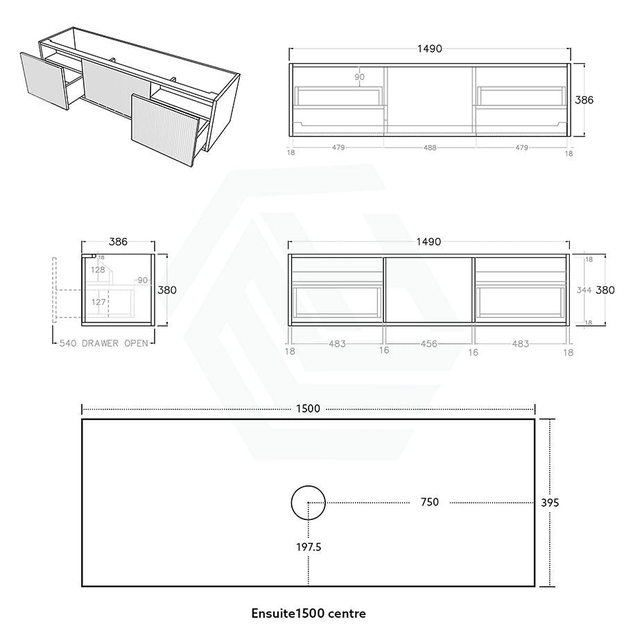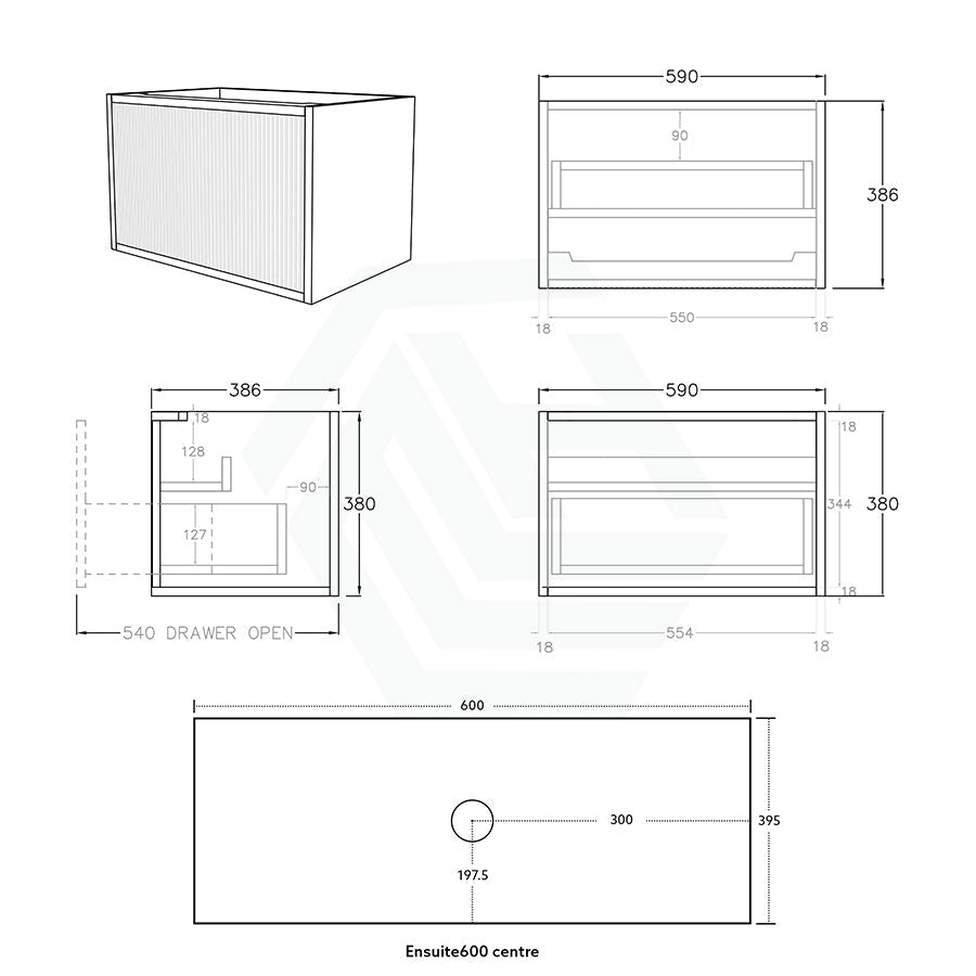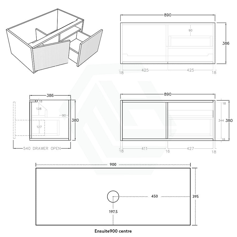 Experience luxury in your bathroom with the Bellevue wall-hung vanity cabinet. Crafted from Coastal Oak Woodgrain, with a thermolaminated V-Groove finish, this exquisite statement piece offers both style and functionality. Push-to-open drawers and internal shelving provide ample storage space. A 40mm Box Trap & Space Saver Kit is included to suit any water outlet. Available in five sizes from 600-1500mm to match any space. Mix and match with a variety of stone tops for a custom look.