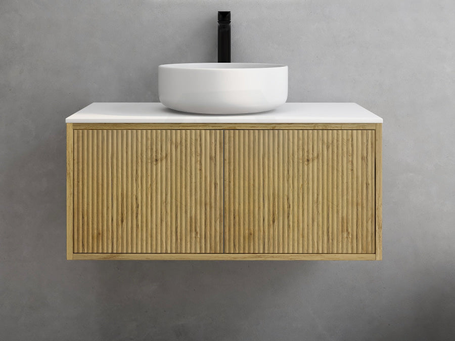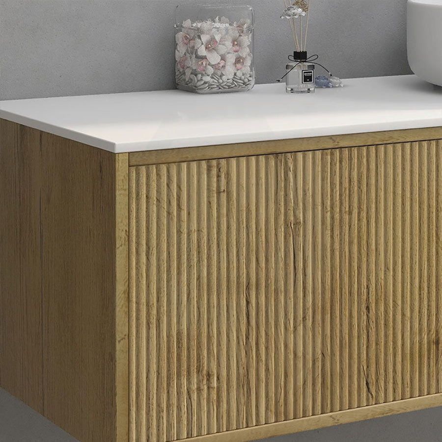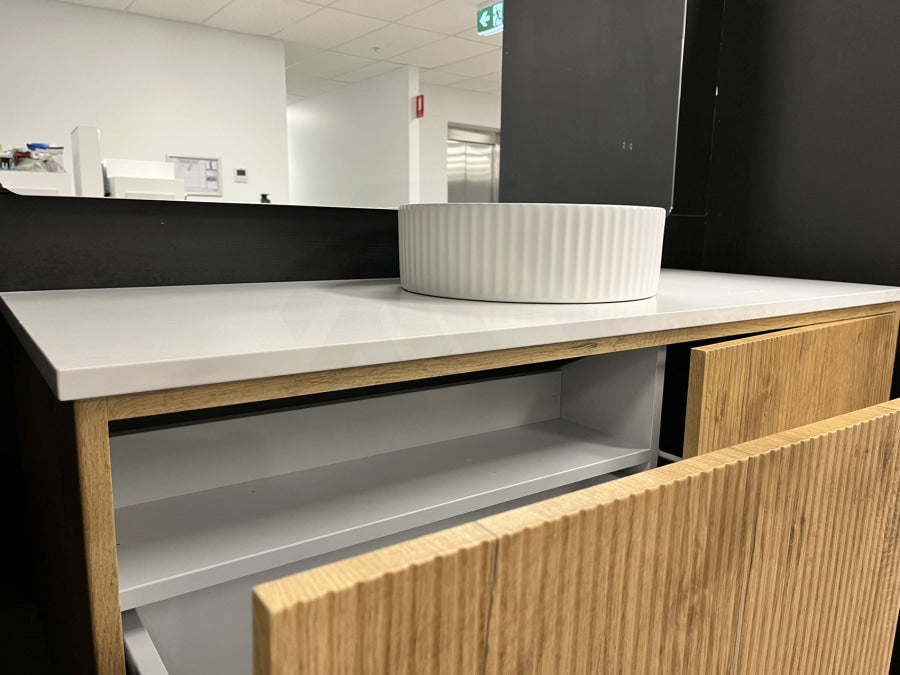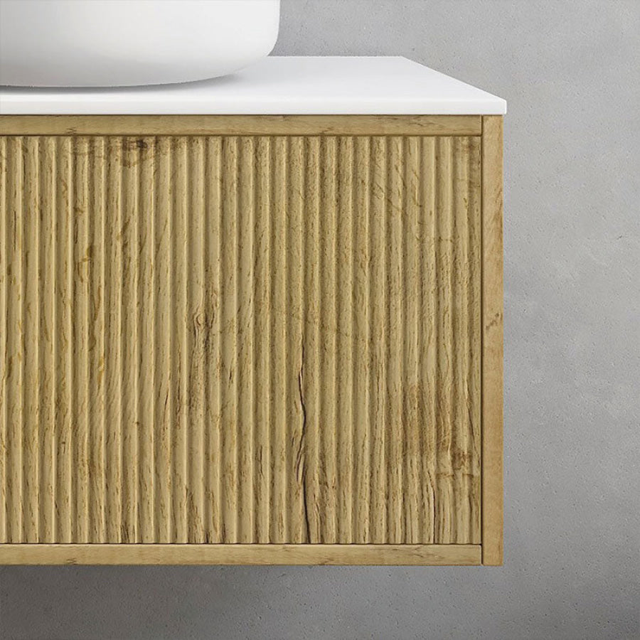 Experience luxury in your bathroom with the Bellevue wall-hung vanity cabinet. Crafted from Prime Oak Woodgrain, with a thermolaminated V-Groove finish, this exquisite statement piece offers both style and functionality. Push-to-open drawers and internal shelving provide ample storage space. A 40mm Box Trap & Space Saver Kit is included to suit any water outlet. Available in five sizes from 600-1500mm to match any space. Mix and match with a variety of stone tops for a custom look.