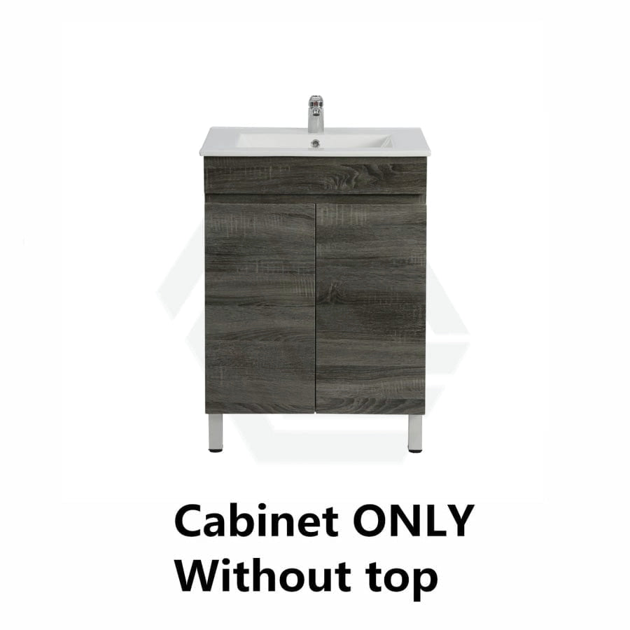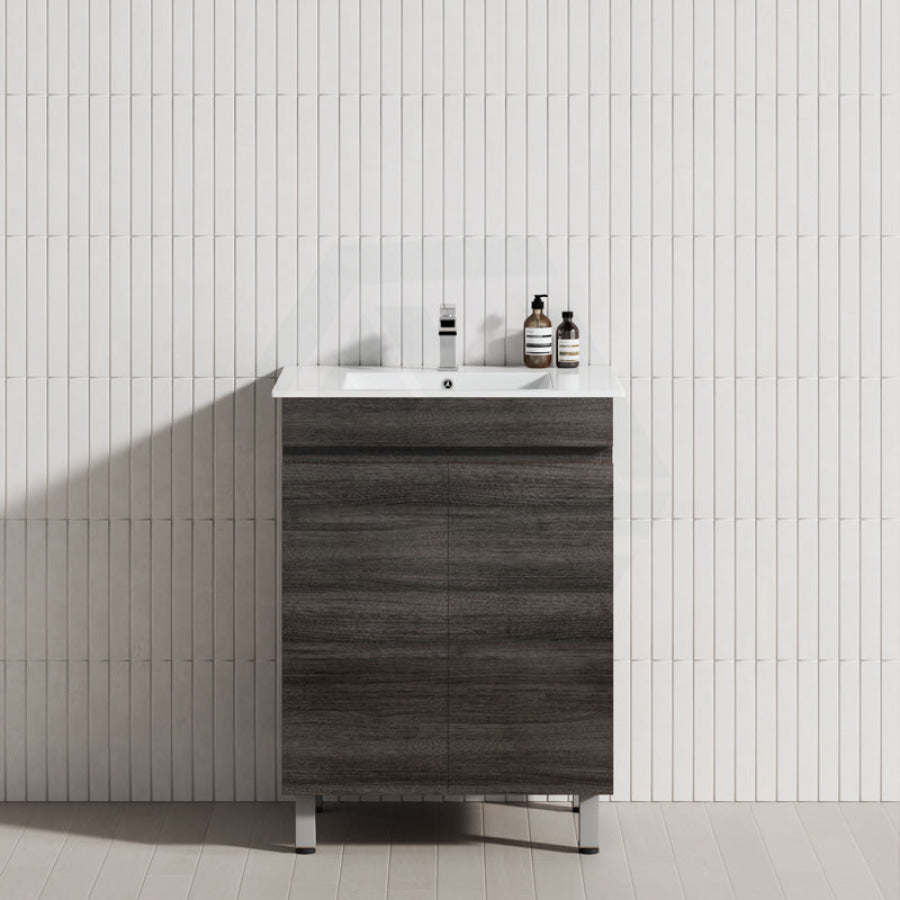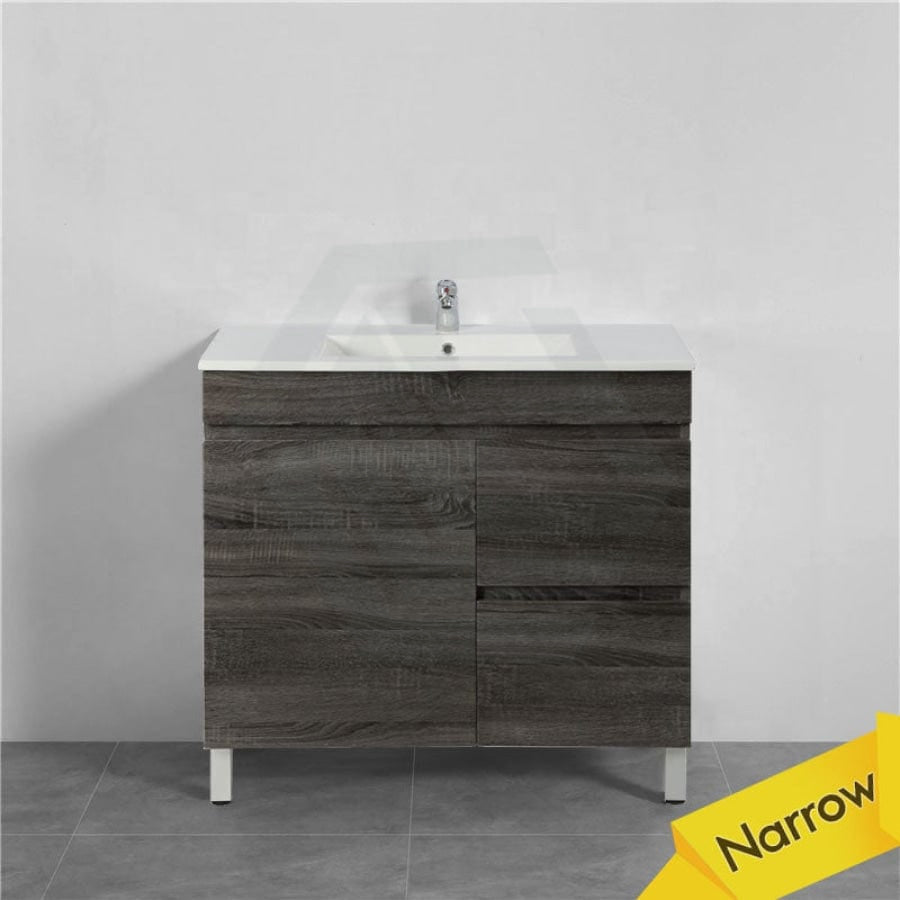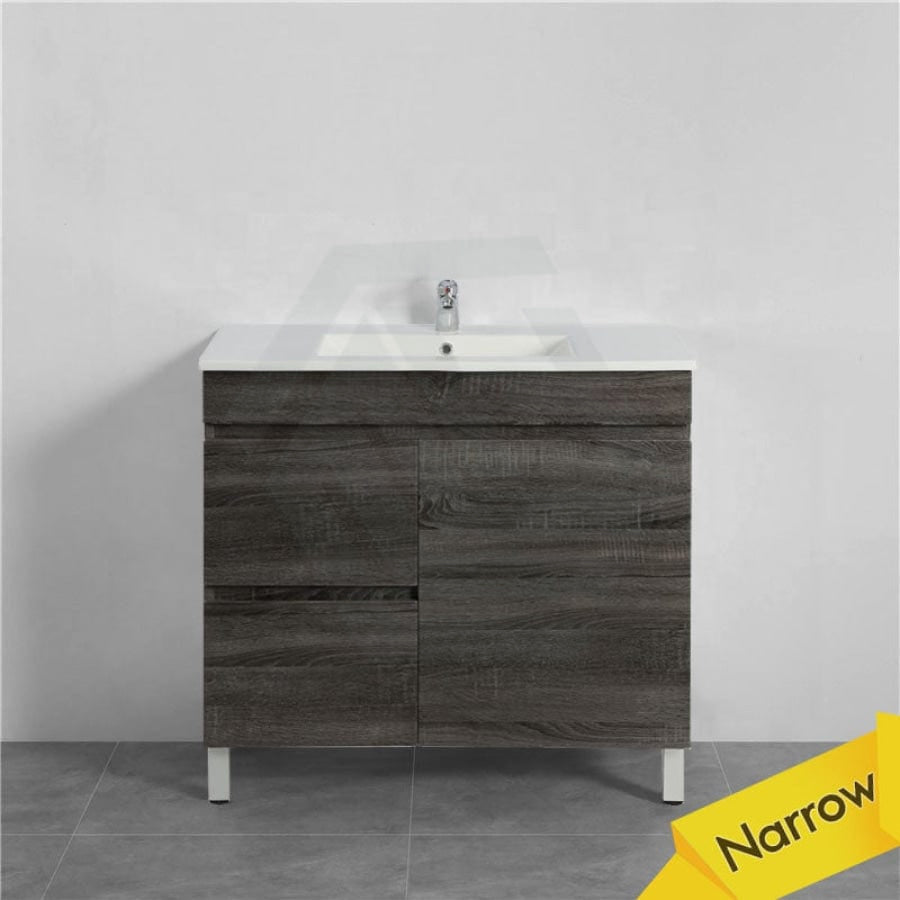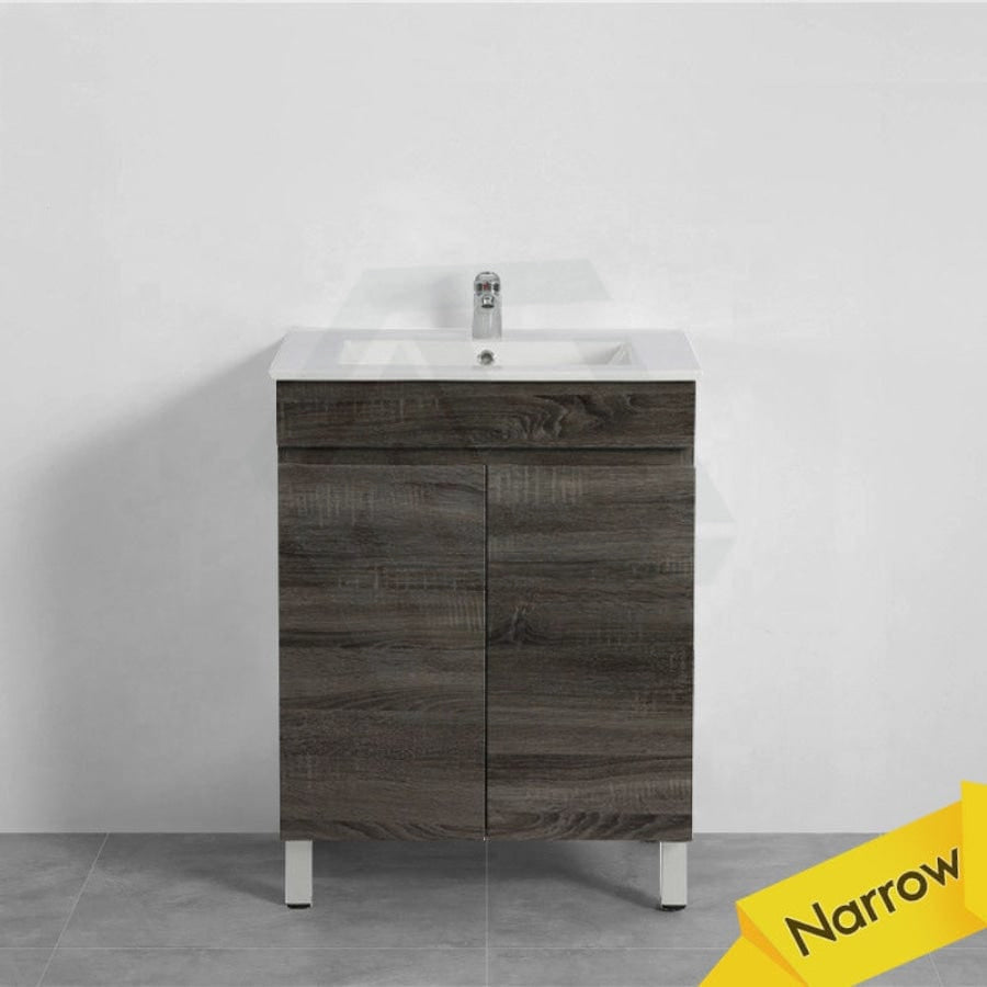 600/700mm NARROW Berge Freestanding Vanity with Legs Dark Grey Wood Grain PVC Filmed Cabinet ONLY & Ceramic / Poly Top Available