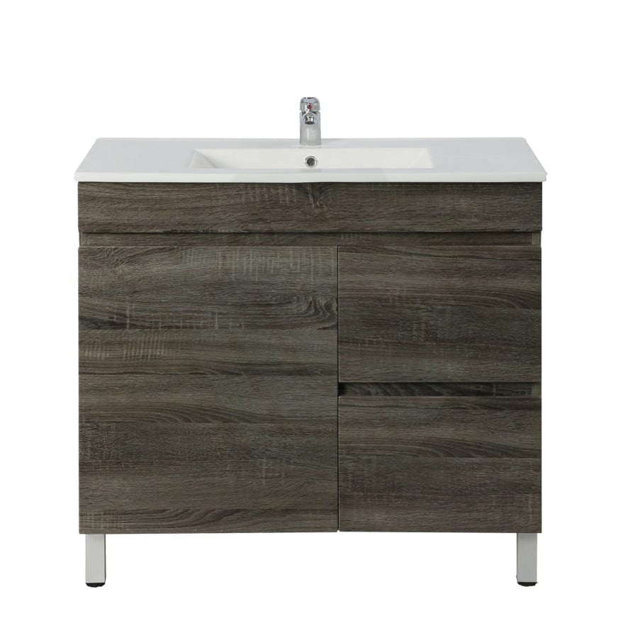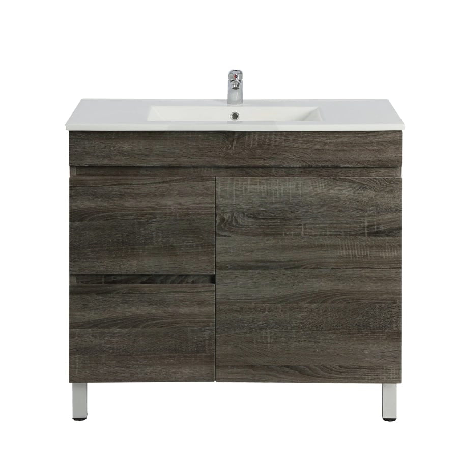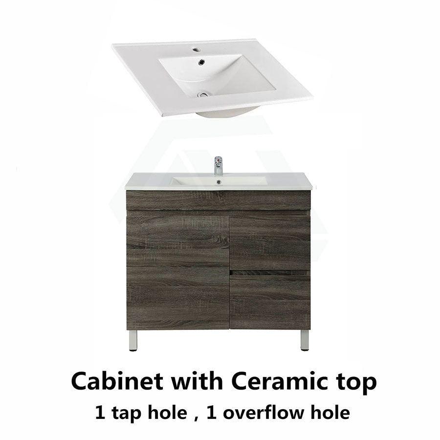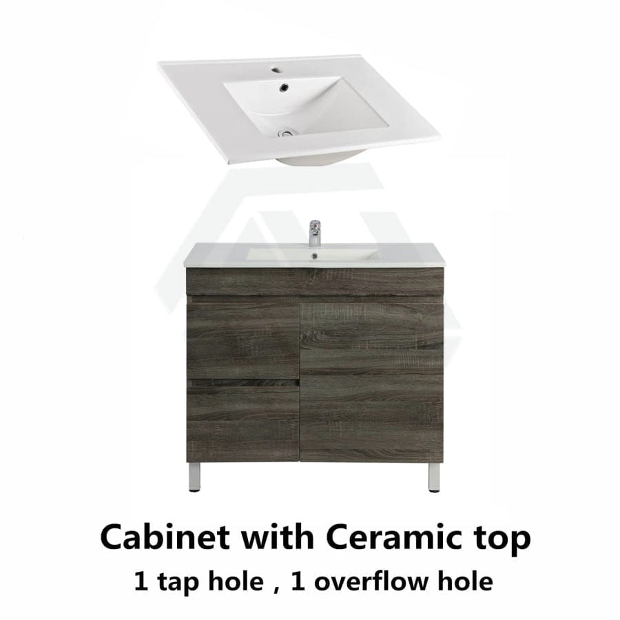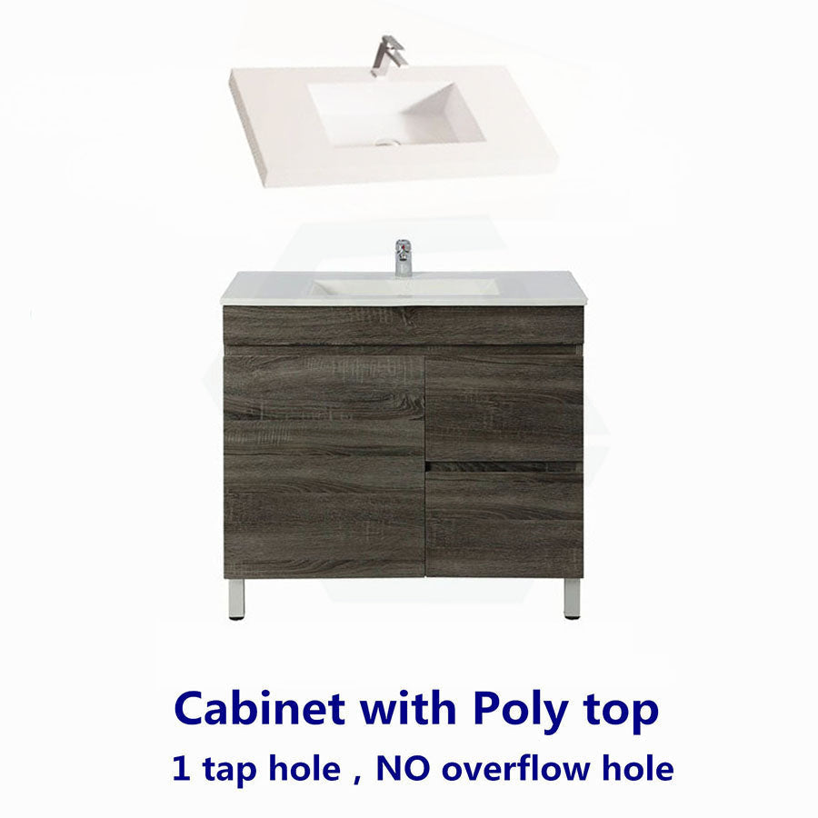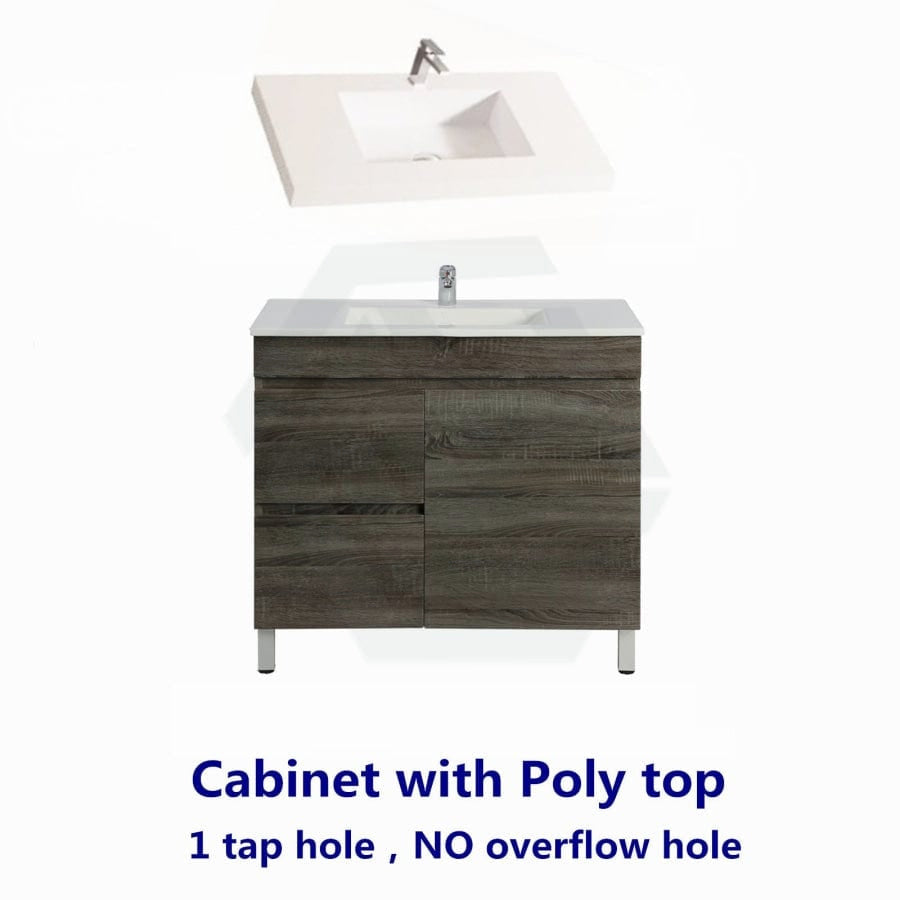 - Freestanding vanity coming with an optional ceramic/poly top.