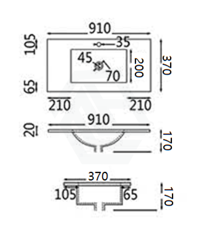 910x370x170mm Ceramic Top for Bathroom Vanity Single Bowl 1 Tap hole 1 Overflow Hole Narrow