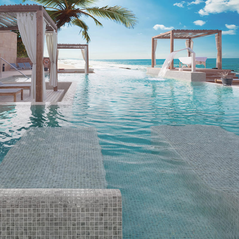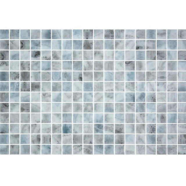 The Kara Grey glass mosaic is composed of square tiles (25x25mm - 1"x1") in grey with blue highlights, featuring a glossy finish and quartz-like gem appearance. A design with personality for pools, spas, and areas in regular contact with water.