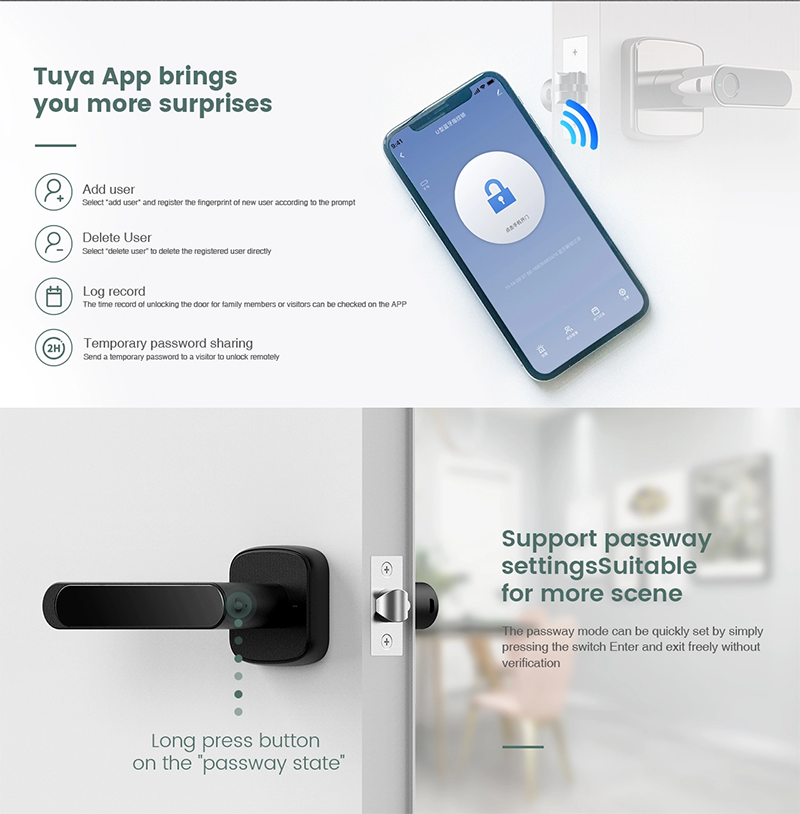 | Control type | Fingerprint, mechanical key, Tuya App |